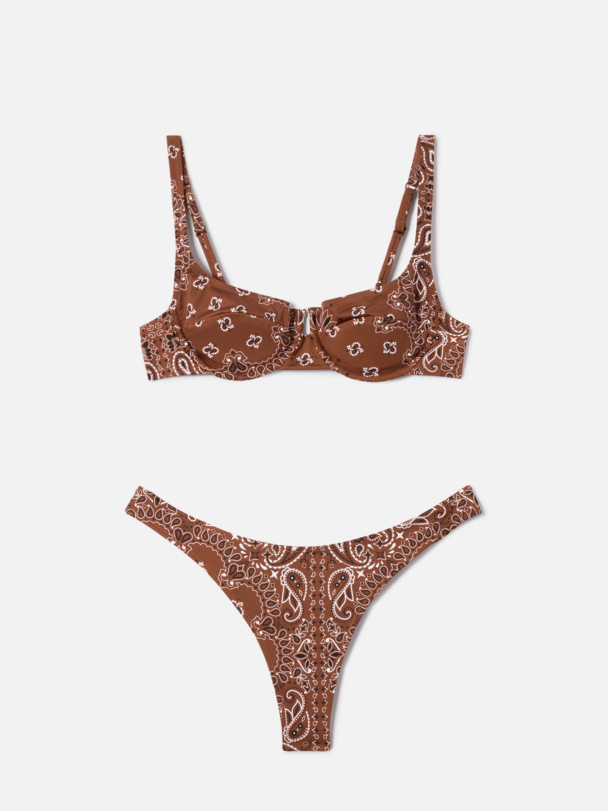 The Amira Naomi bikini is crafted from stretch fabric designed to enhance the silhouette with a balanced combination of support and comfort. The Amira balconette top features a bandana print in brown tones, defining the model with a graphic and contemporary aesthetic. The structure with padded cups and underwire ensures high support and a defined shape, while adjustable straps allow a customizable fit and improved stability. The Naomi Brazilian bottom completes the bikini with an all-over bandana print in brown tones. The lined construction with reduced coverage enhances the silhouette with a balanced close fit.