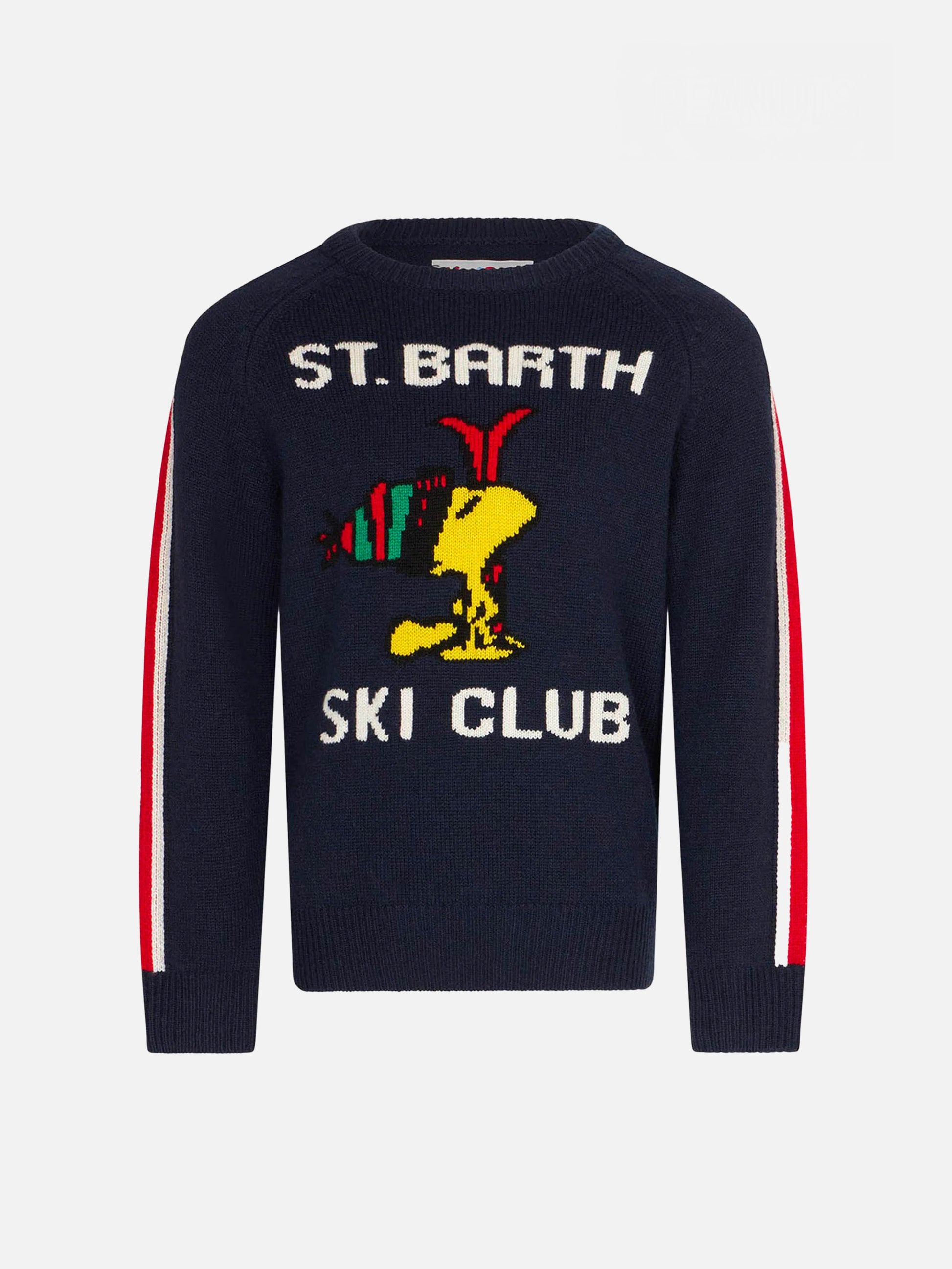 marineblauer Rundhalspullover für Jungen Schriftzug des St. Barth Skiclubs auf der Vorderseite Woodstock-Druck Raglanärmel Weiße und rote Details an den Ärmeln Woodstock – Peanuts™ Sonderedition