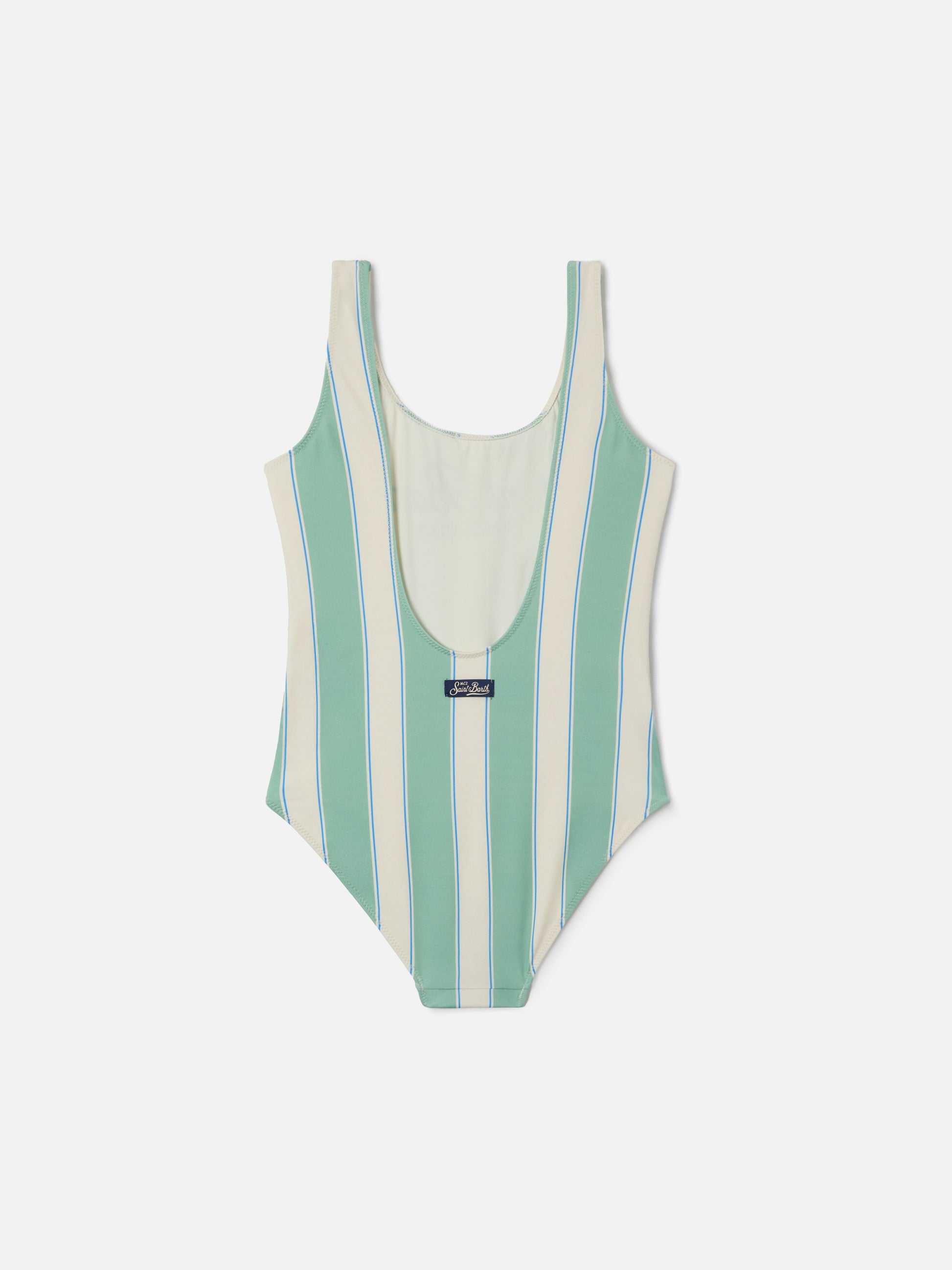 The Cara one-piece swimsuit is crafted in stretch fabric and features vertical green and white stripes with a summery look. The design includes a round neckline and wide straps for a stable and comfortable fit. The central Saint Barth Beach Club print adds a distinctive touch. Fully lined and perfect for beach and pool wear.