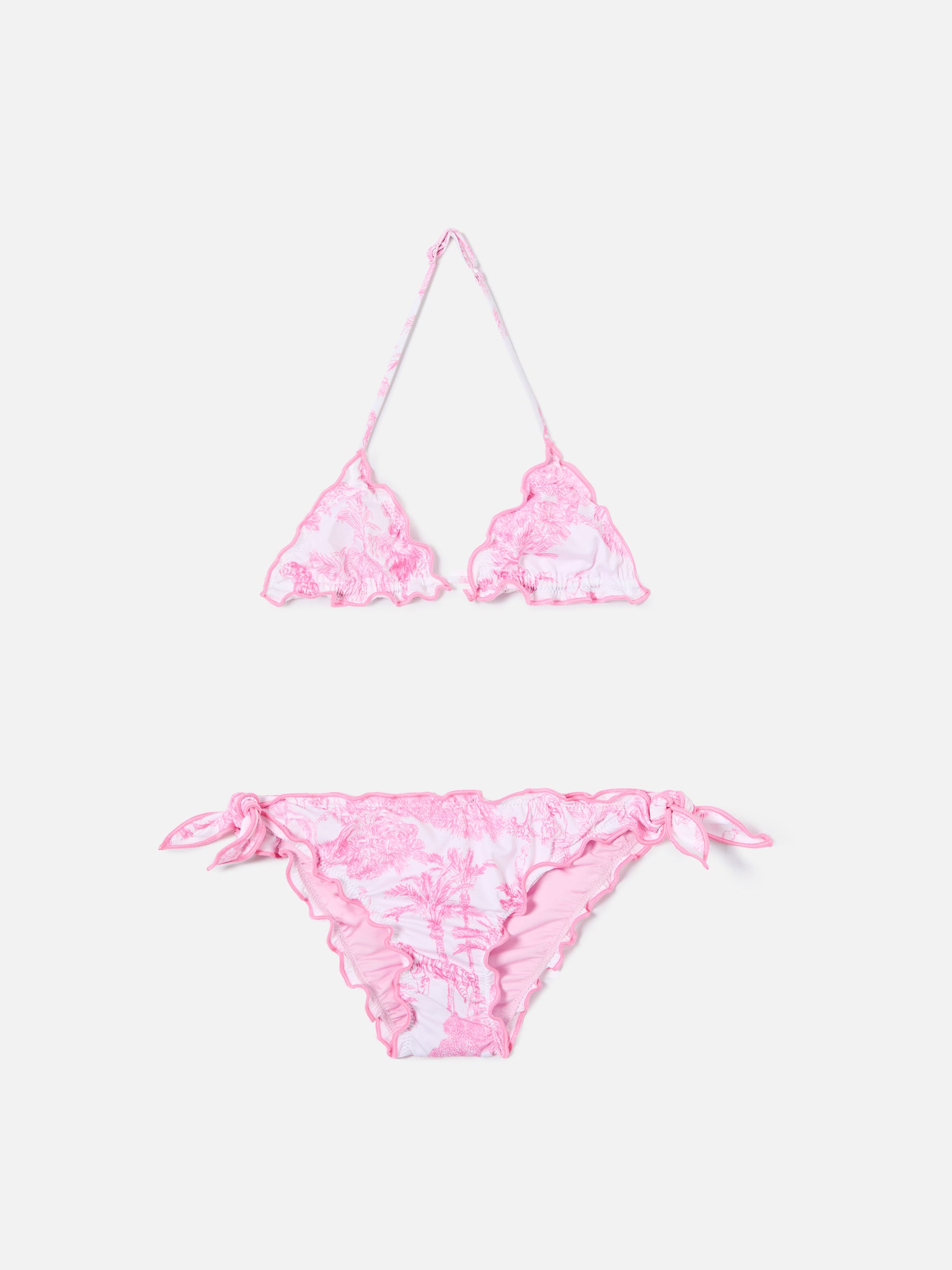 The Cris bikini is crafted in stretch fabric and features an all-over pink toile de jouy print on a light pink base. The style includes a triangle top with adjustable ties and ruffled edges, paired with size-dependent bottoms construction. The swimsuit is lined and features a fitted silhouette.