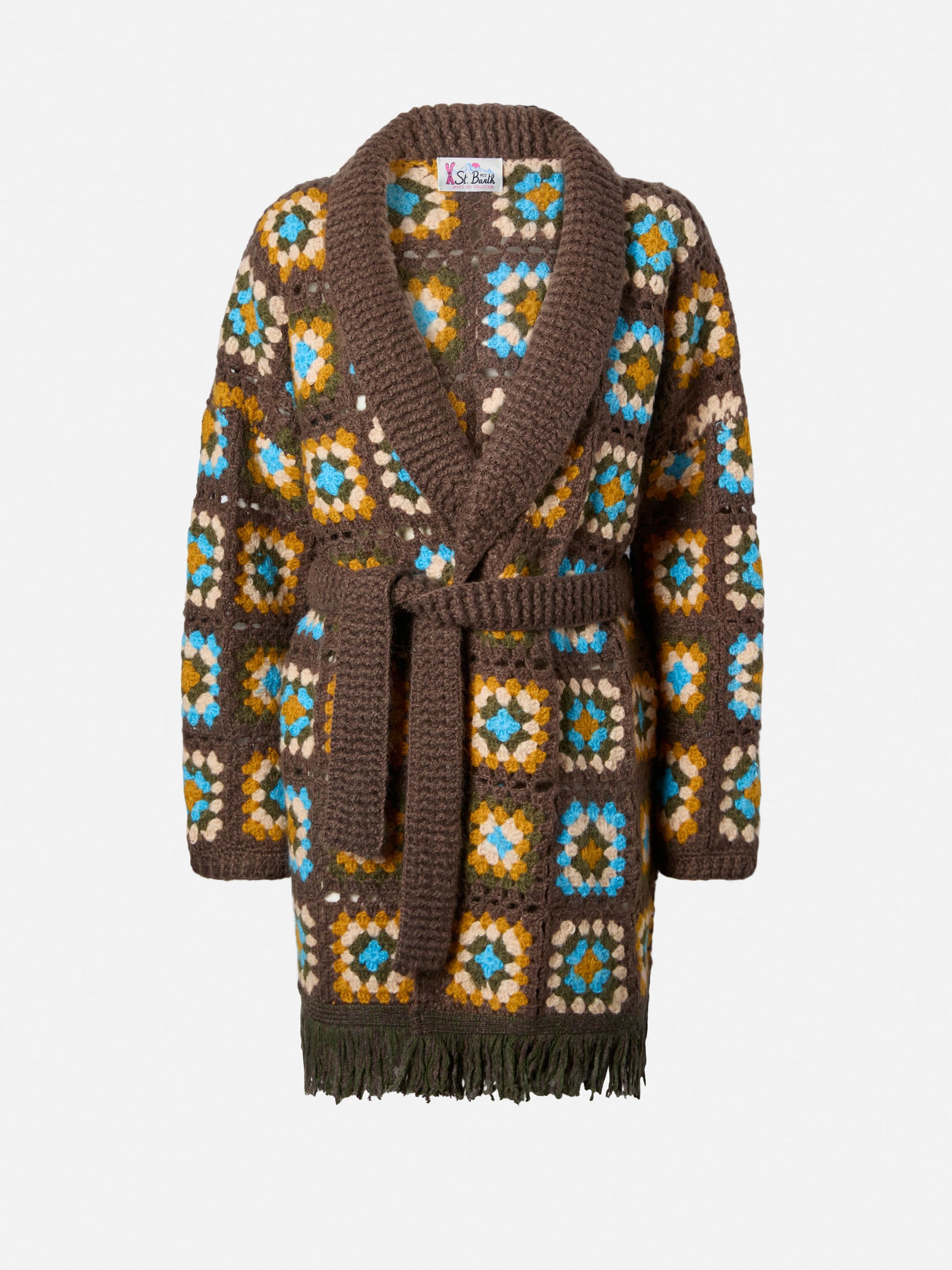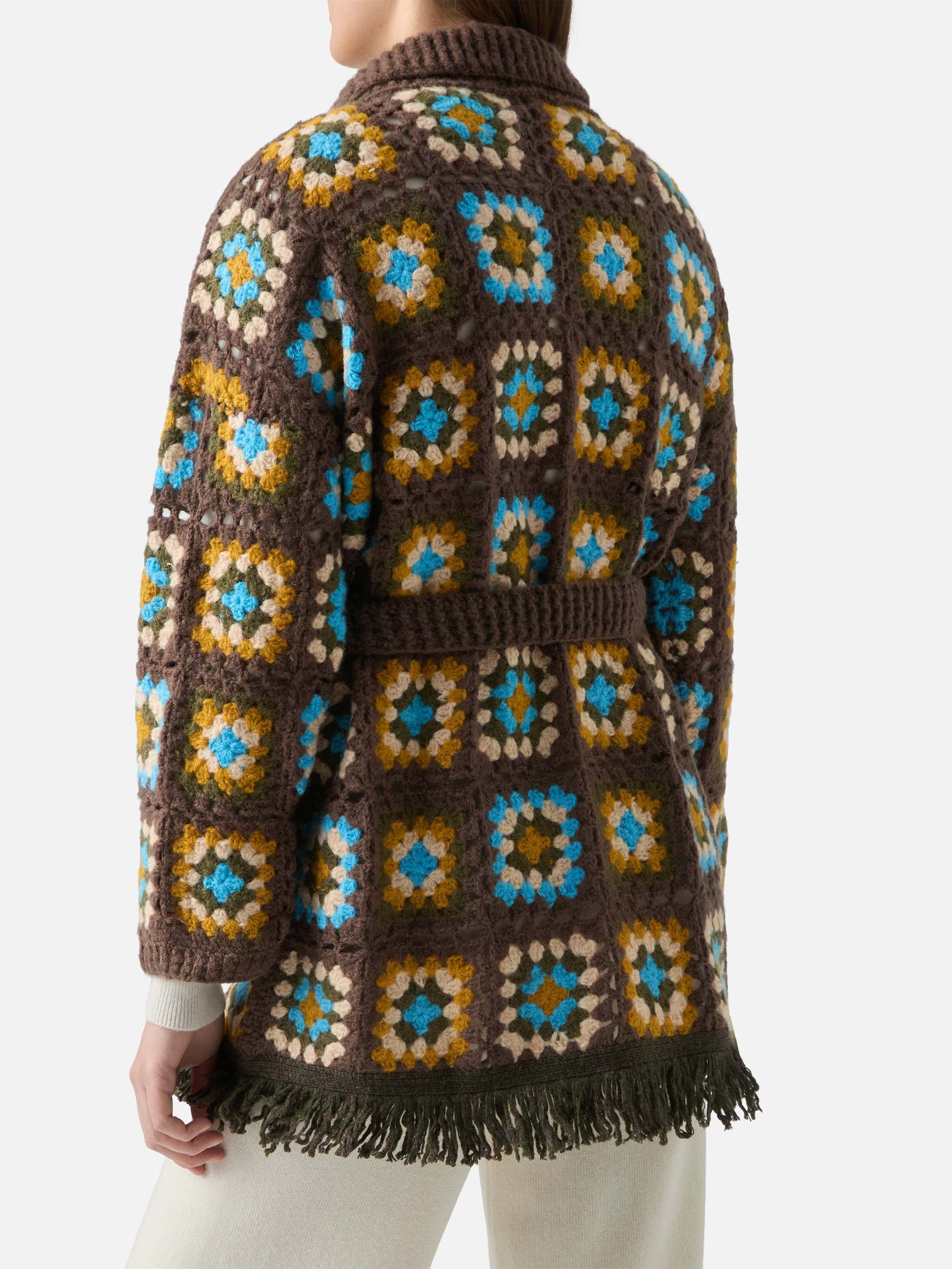 A fully crochet-crafted cardigan designed in a rich autumn palette of deep green and warm yellow tones. The artisanal ethnic-inspired pattern adds texture and character, while the fringed hem brings a boho-chic, free-spirited touch. Finished with a matching belt to define the waistline and a subtle St. Barth logo on the back, this soft cashmere-blend cardigan is the ideal statement piece to elevate your seasonal wardrobe with color, craftsmanship, and comfort.