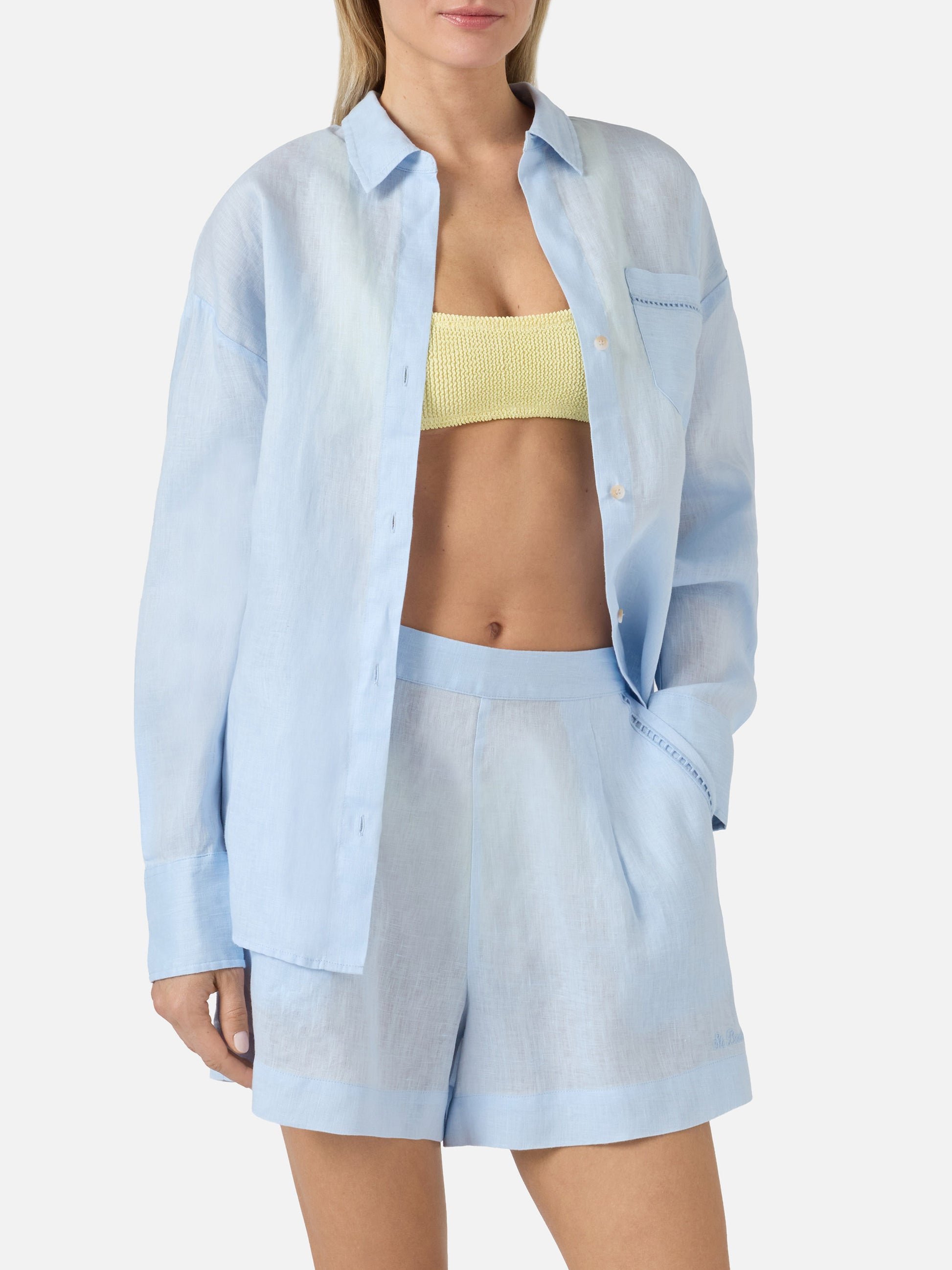 Light blue linen Cristal shirt with perforated Saint Barth embroidery