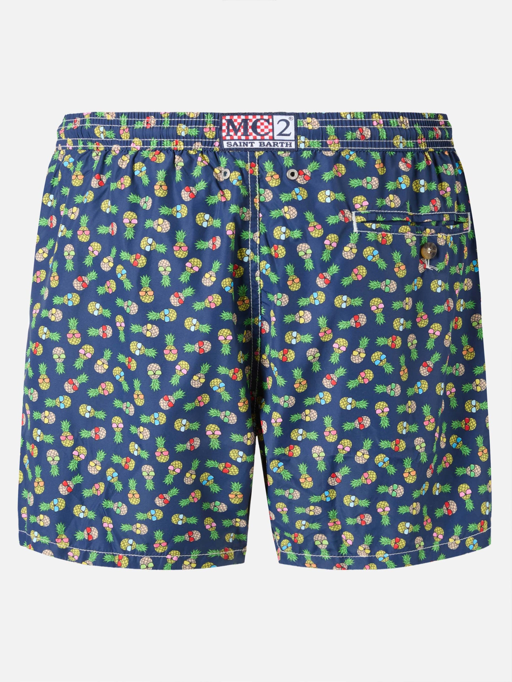 Man Lighting mid-length swim shorts are designed with a lightweight fabric that dries quickly, earning their name Lighting. Crafted from 100% recycled polyester, these shorts reflect our commitment to sustainability. Man Lighting mid-length swim shorts Lightweight Quick drying Pineapple all-over print Navy blue backcloth Comfortable elasticized waistband Adjustable drawcord with branded terminals Inner mesh lining Side pockets with French seams Back patch pocket with button closure Branded eyelets designed to drain water and prevent ballooning effect MC2 Saint Barth exclusive label on the back Classic fit Composition: 100% recycled polyester Size L has a half waistband width of 52,5 cm (stretched) and varies by 2 cm for each size; side length including waistband 39,5 cm and varies by 1 or 1,5 cm for each size, depending on the size Please note that all measurements provided are approximate and subject to a tolerance of 1-2 cm due to manual measurement. This tolerance range is normal and should be expected. Model is 185 cm and wears a size large Care Instructions: cold wash by running water and neutral soap. Hang to dry. Do not leave to soak and do not dry in contact with other clothing. Do not leave the garment wet in contact with other clothing.