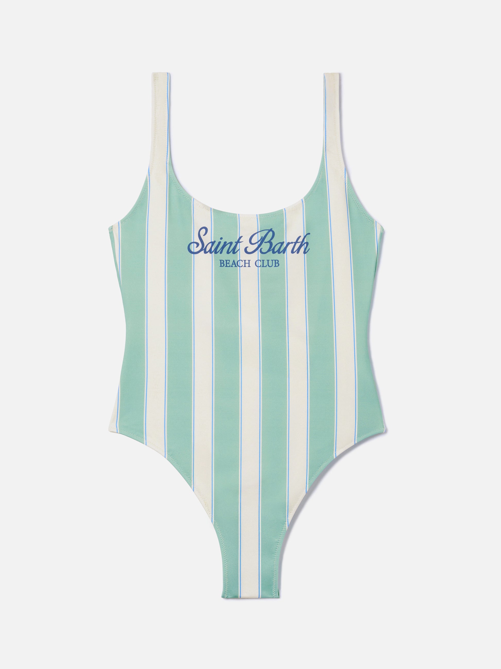 Lora one-piece swimsuit in sage green and cream striped design with Beach Club print