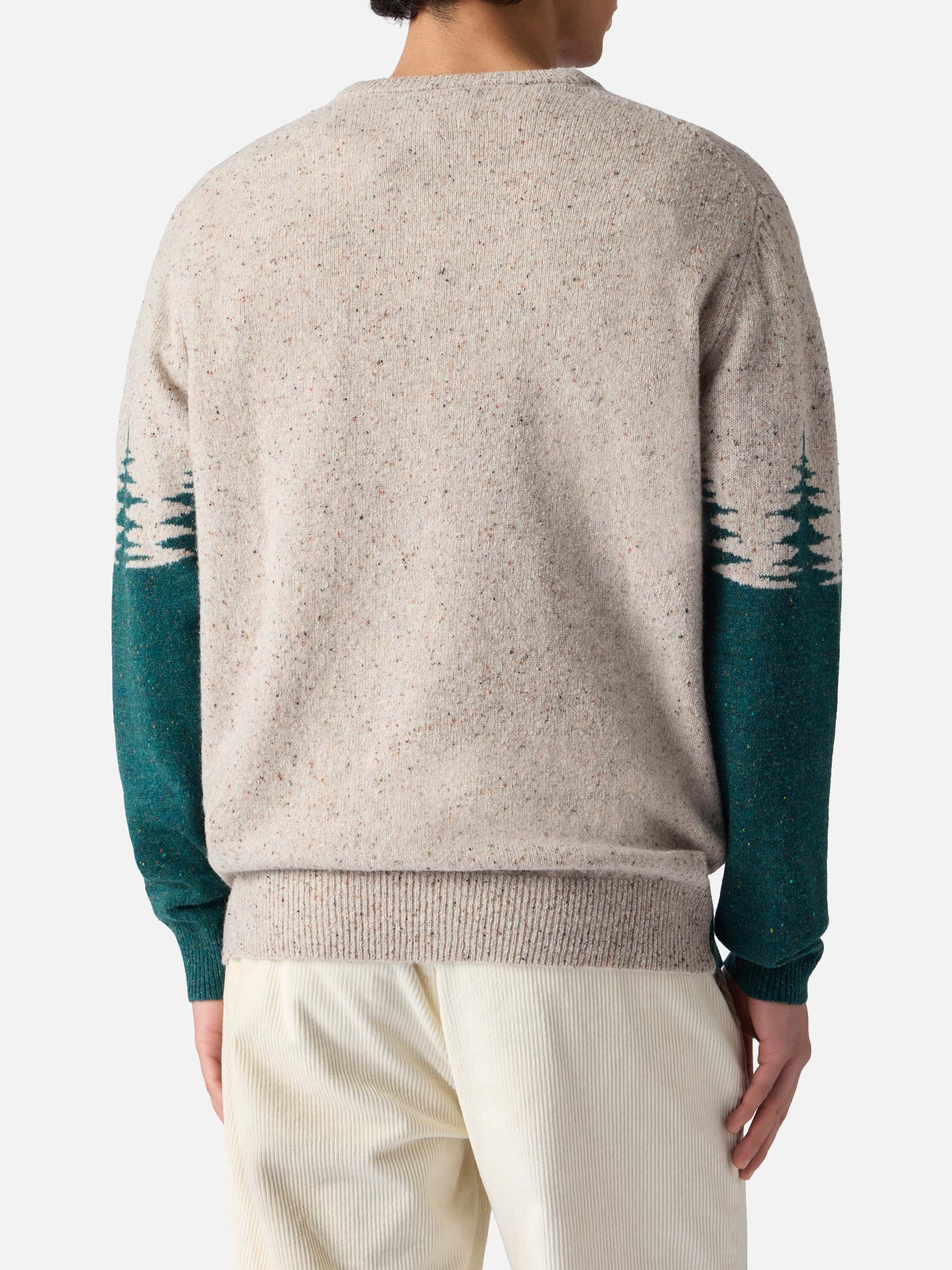 Donegal-Pullover mit Rundhalsausschnitt und Reihermotiv mit Jacquard-Muster und Postkartenmotiv aus St. Moritz
