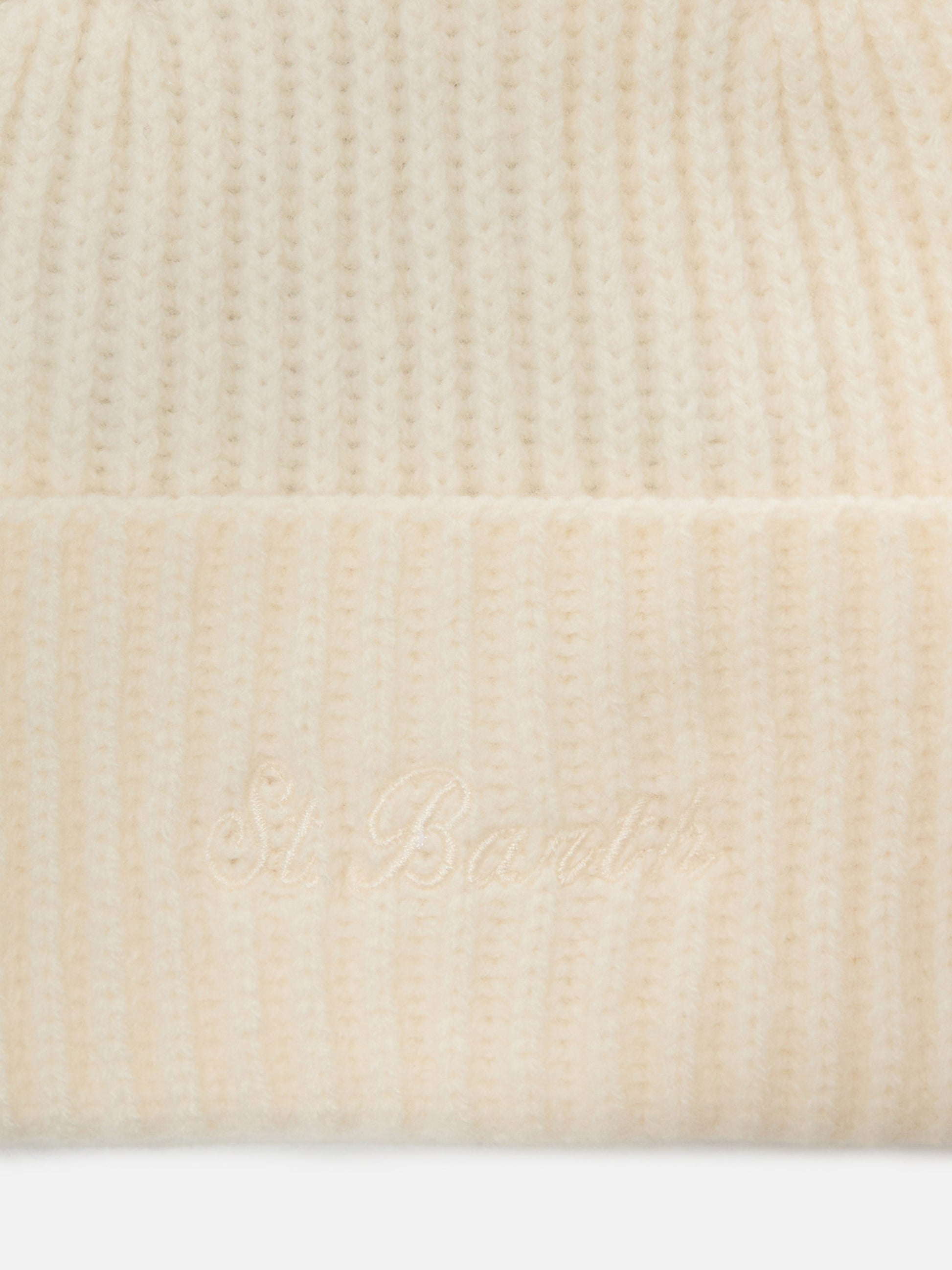 Moosgrüne Mütze aus 100 % Wolle mit St. Barth-Stickerei in Weiß.