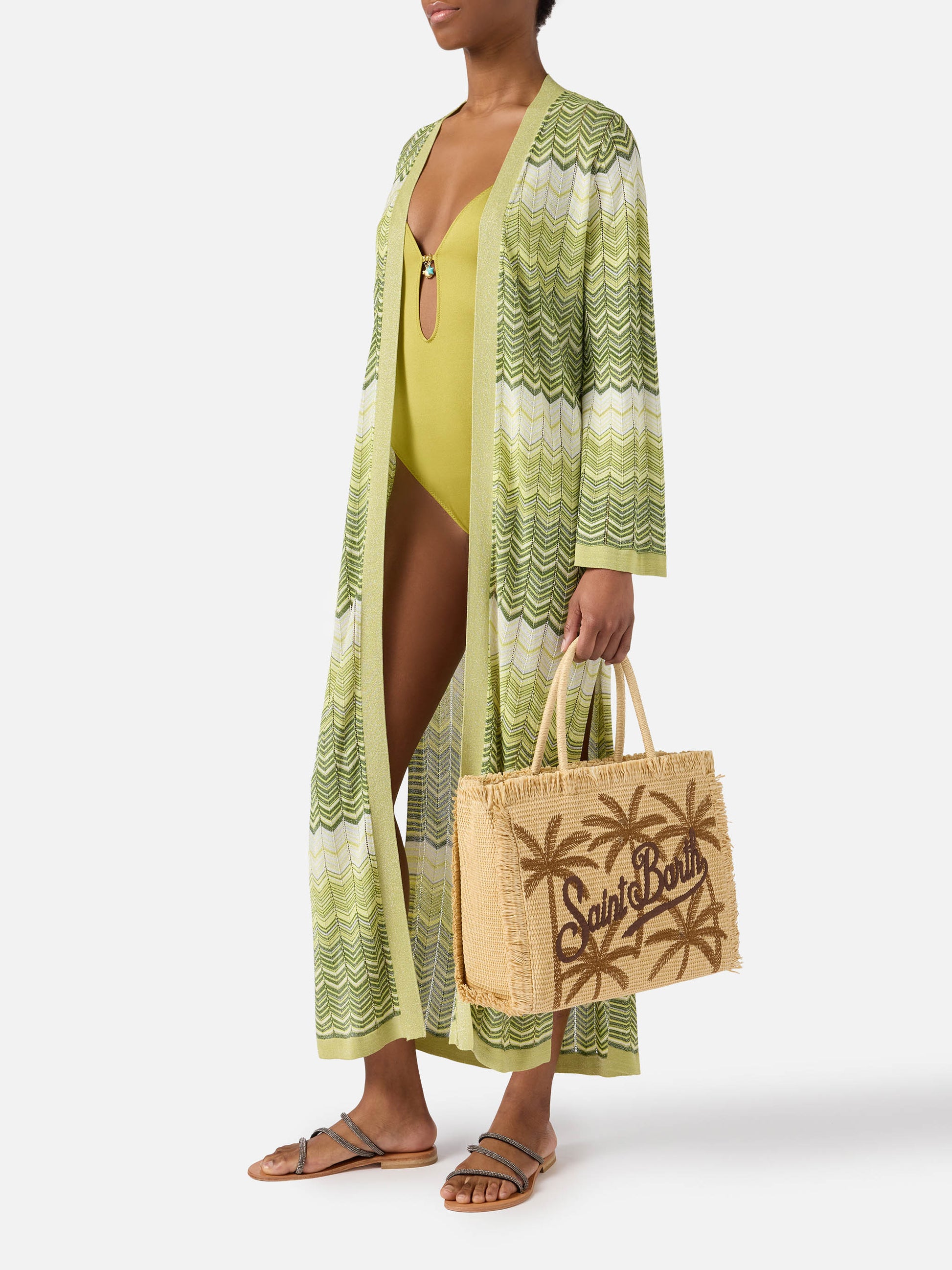 Regular Vanity straw effect bag with palm embroidery