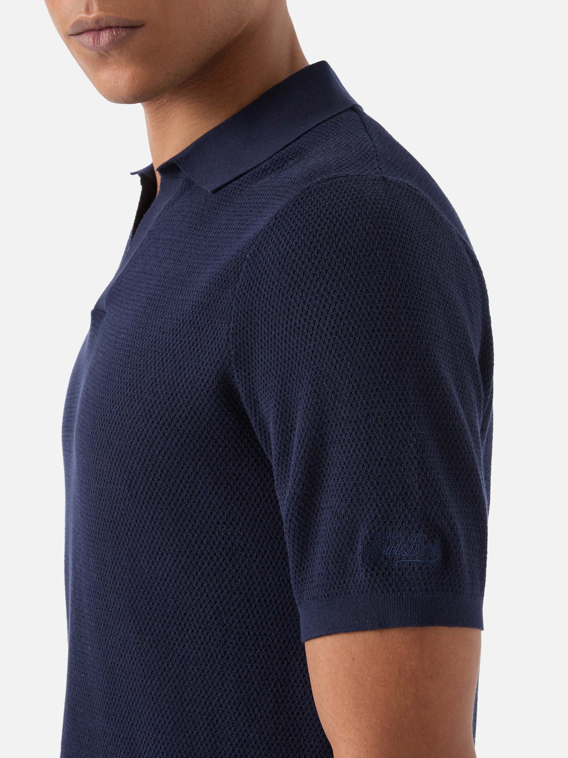 The Sloan Mesh polo is crafted from premium high-twist cotton and stands out for its three-dimensional perforated knit construction, adding depth and texture to the fabric. The blue tone is enhanced by the classic collar and the buttonless front opening for a refined and contemporary look. A distinctive style, perfect for elevated yet relaxed outfits.