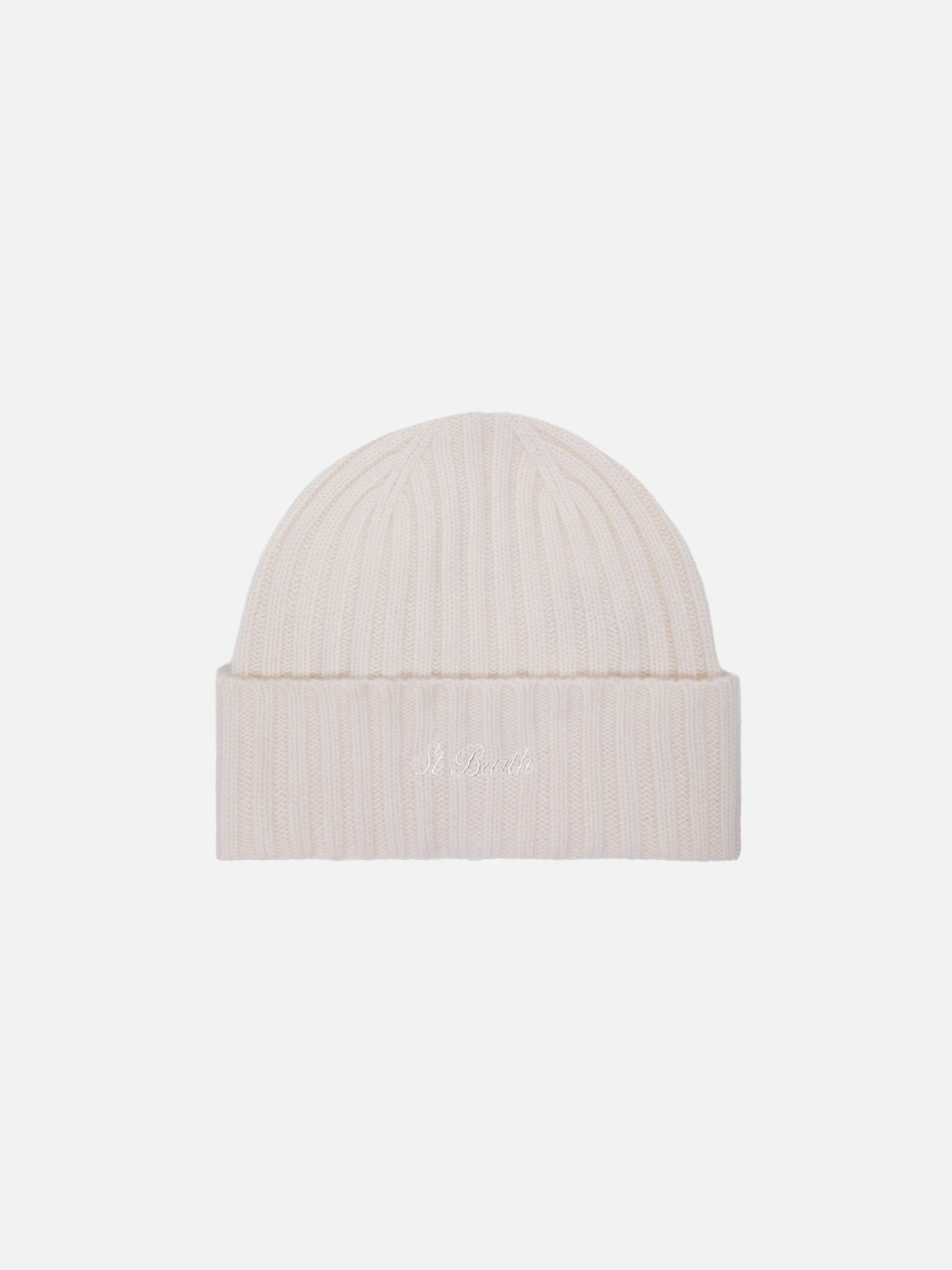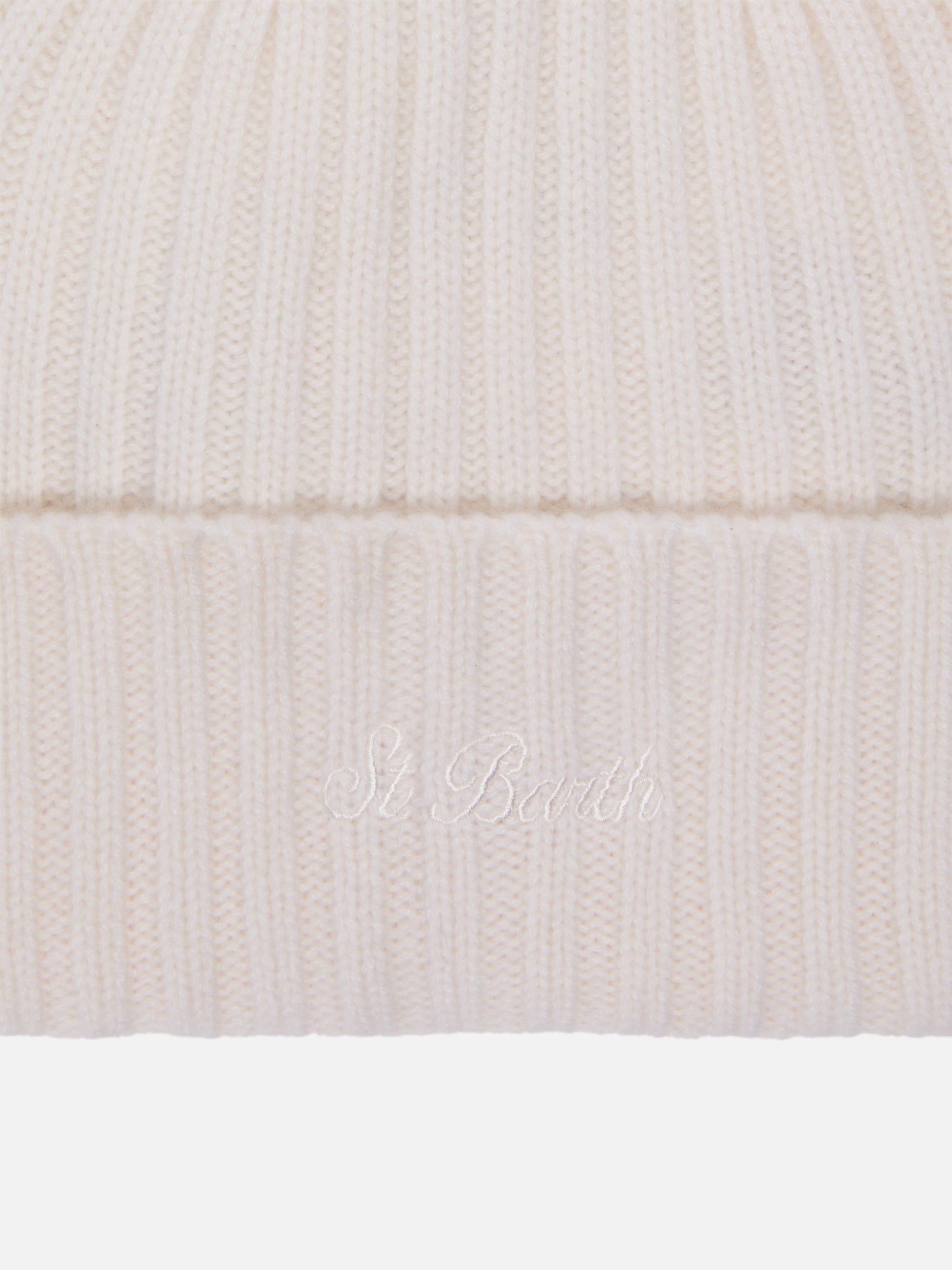 Wengen-Mütze aus weißem Kaschmir mit St.-Barth-Stickerei am Umschlag