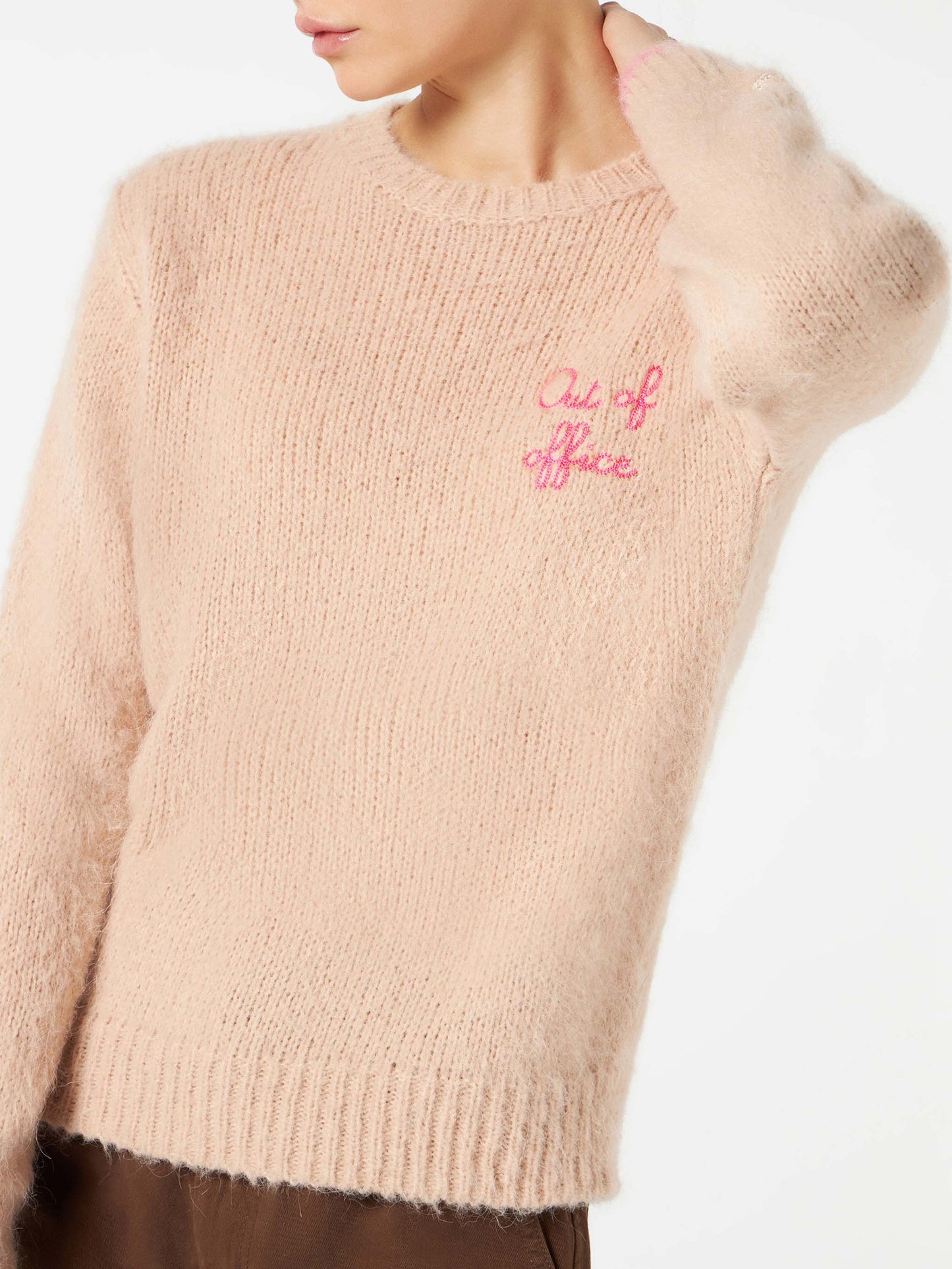 Beigefarbener, gebürsteter Damenpullover mit Stickerei