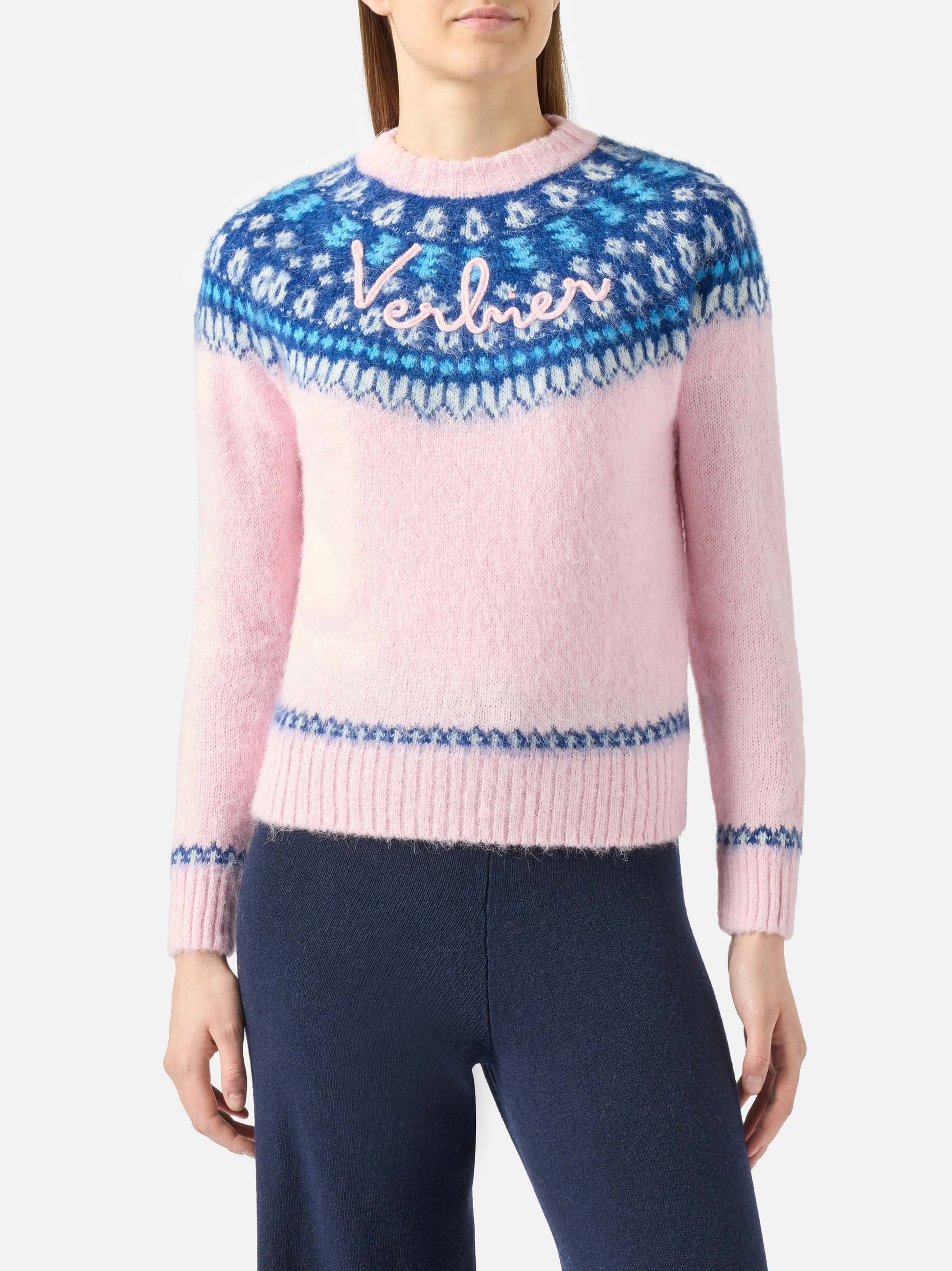 Rosafarbener Damen-Rundhalspullover aus nordischem Jacquard