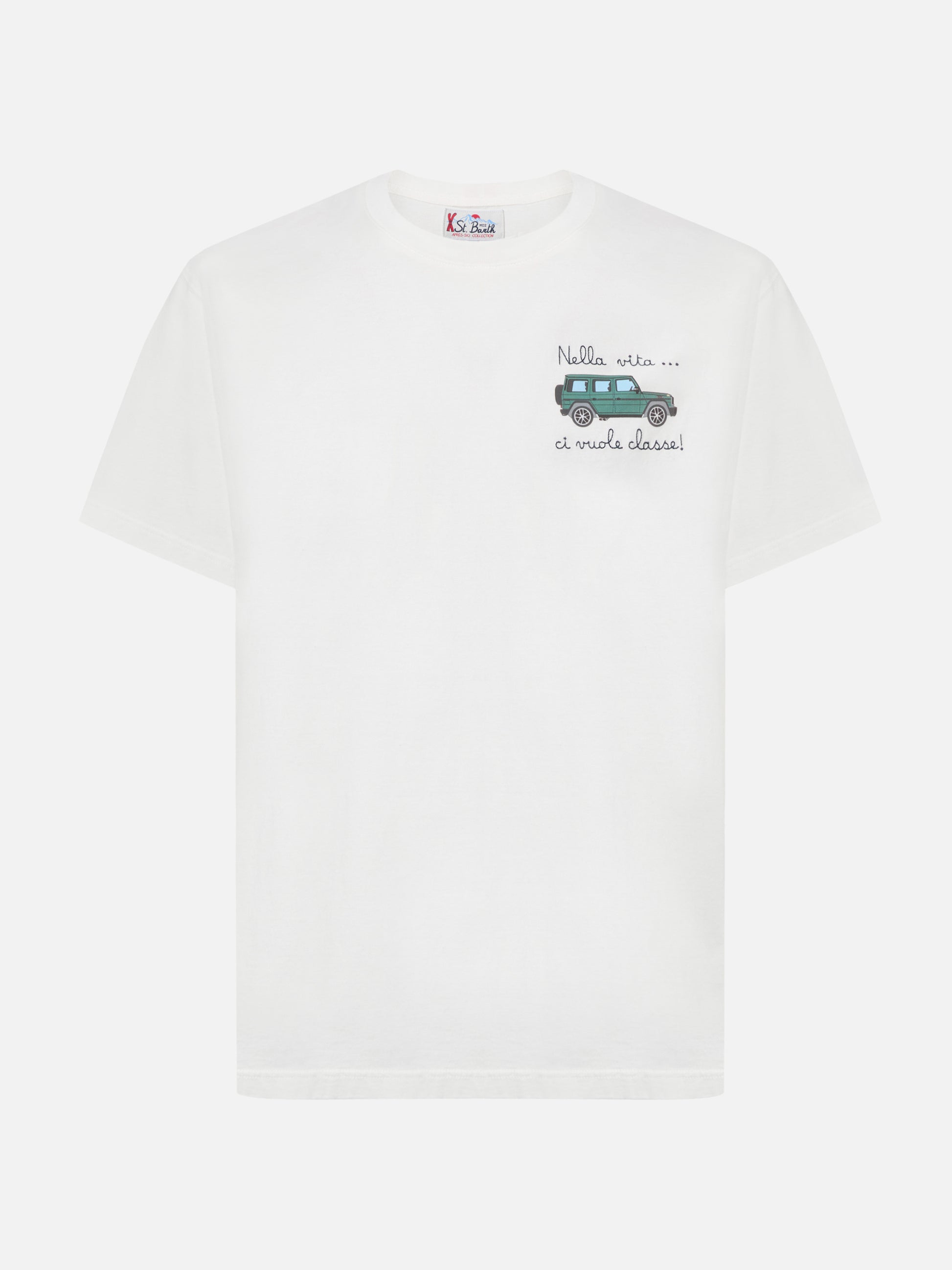T-shirt Arnott in cotone bianco con ricamo macchina Nella vita ci vuole classe