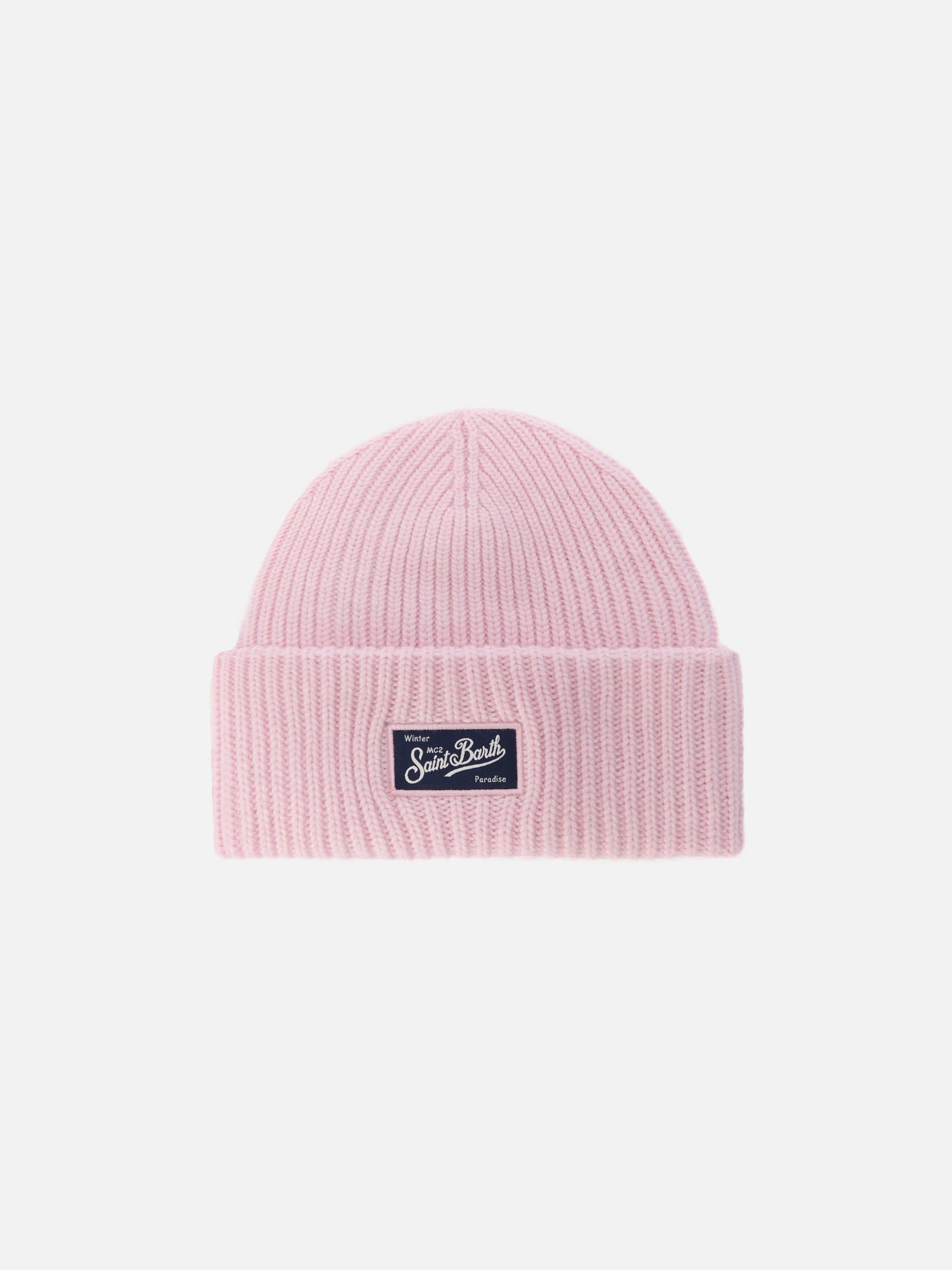 Berretto Berry Jr a coste in misto cashmere rosa con ricamo St. Barth