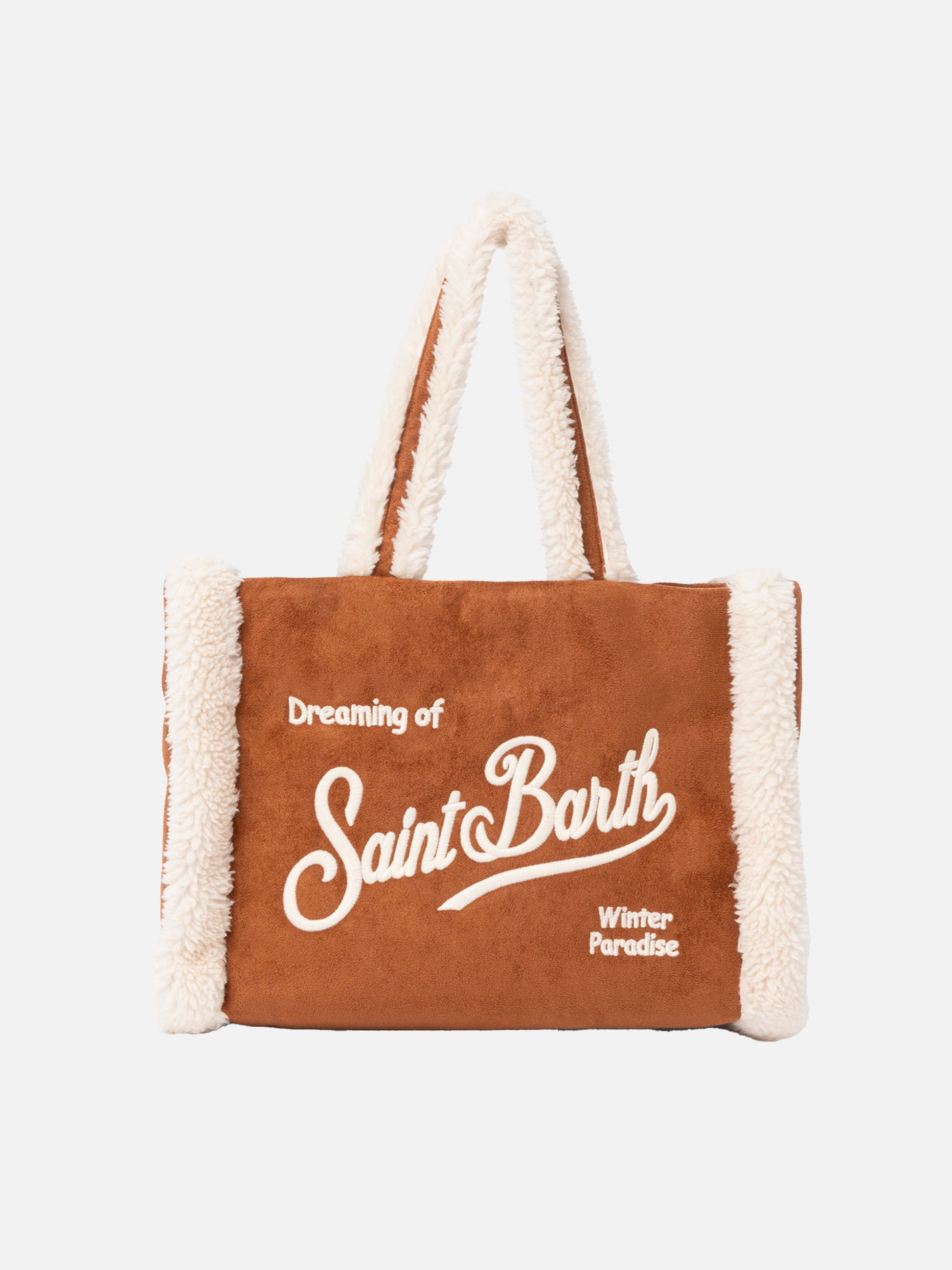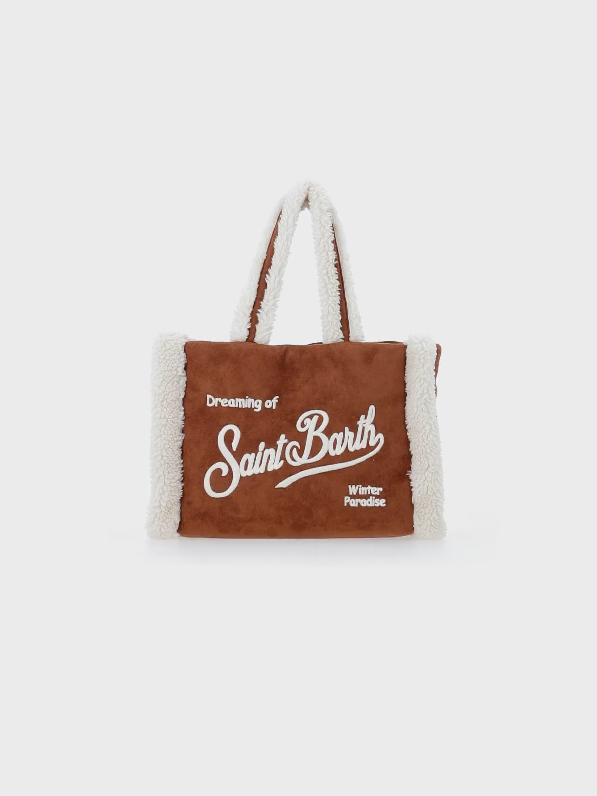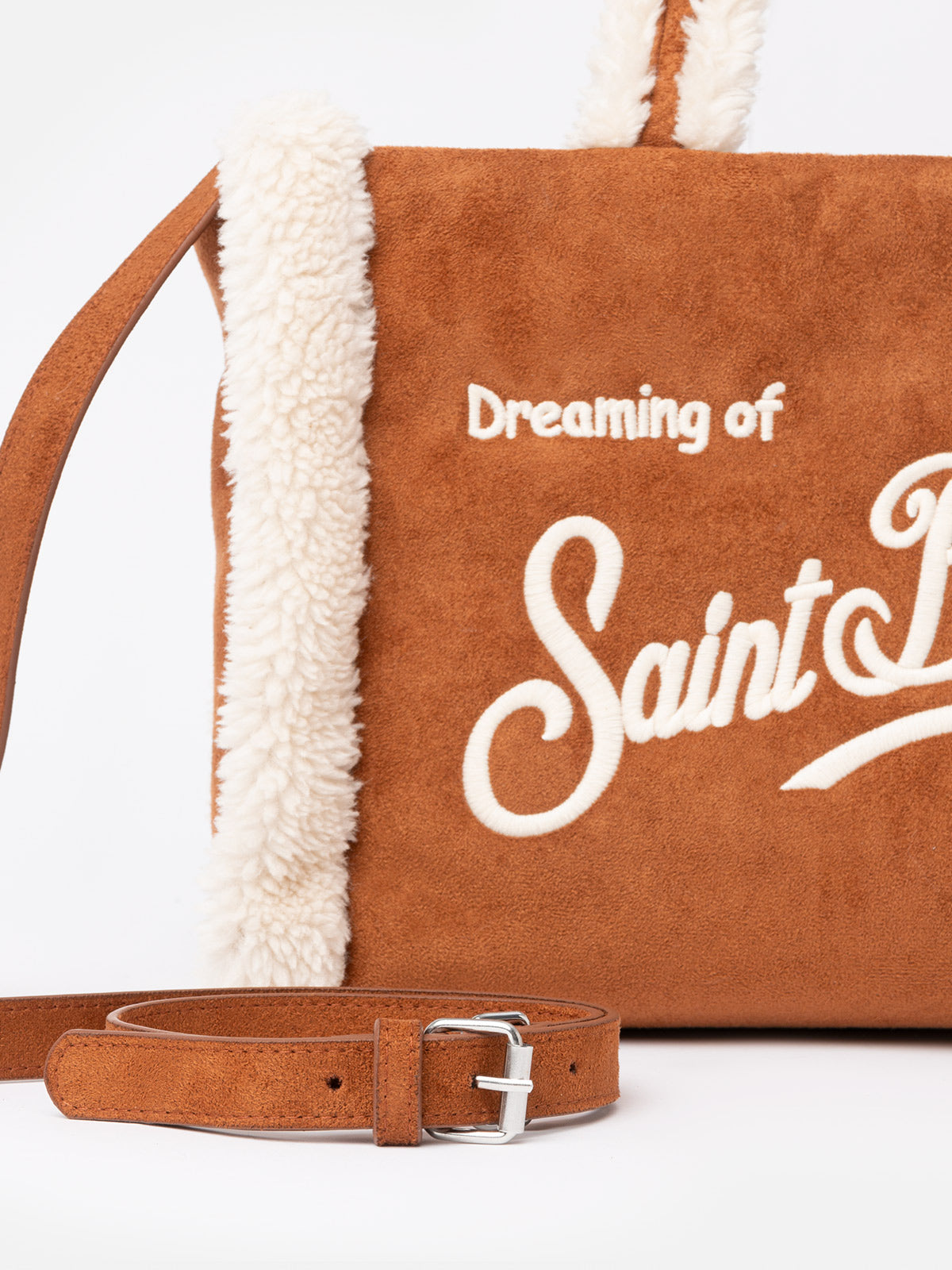 Borsa piccola morbida in pelle di montone color cammello con logo Saint Barth e tracolla