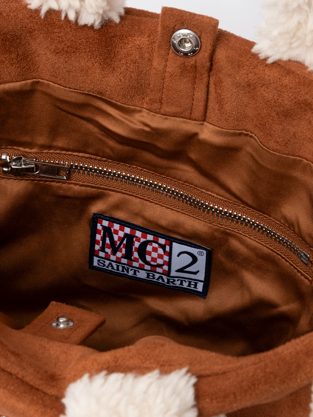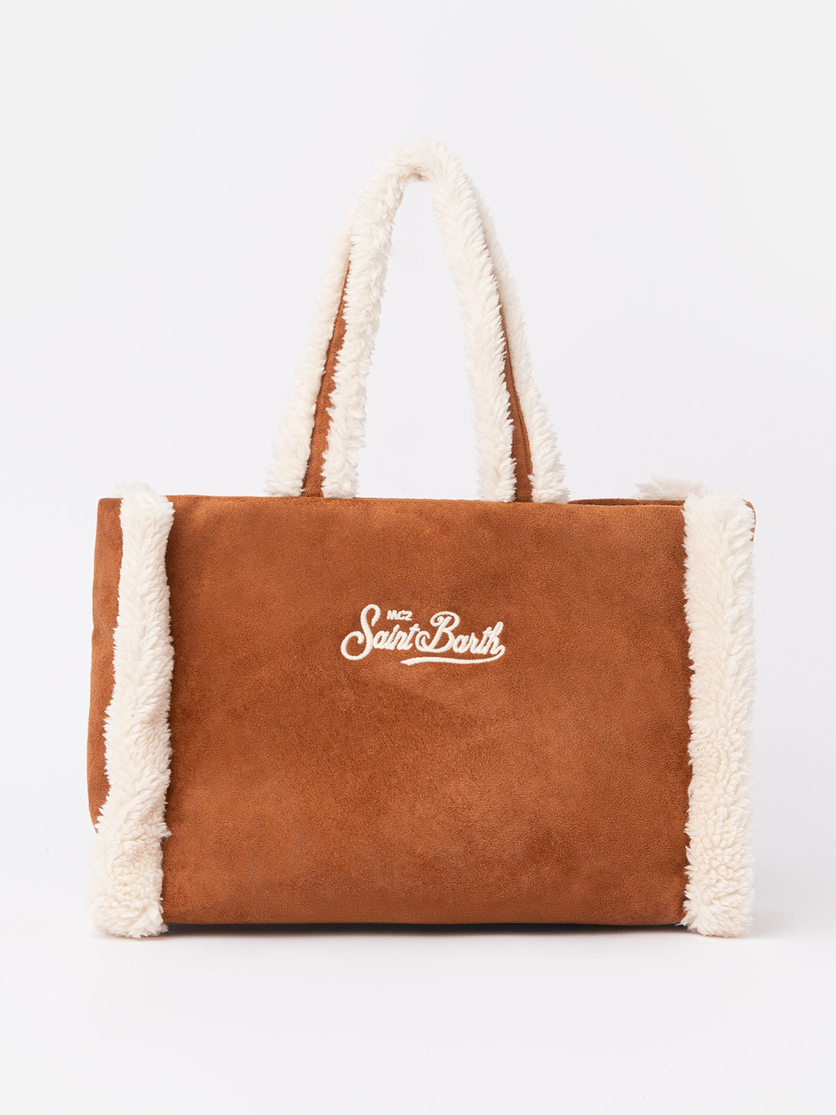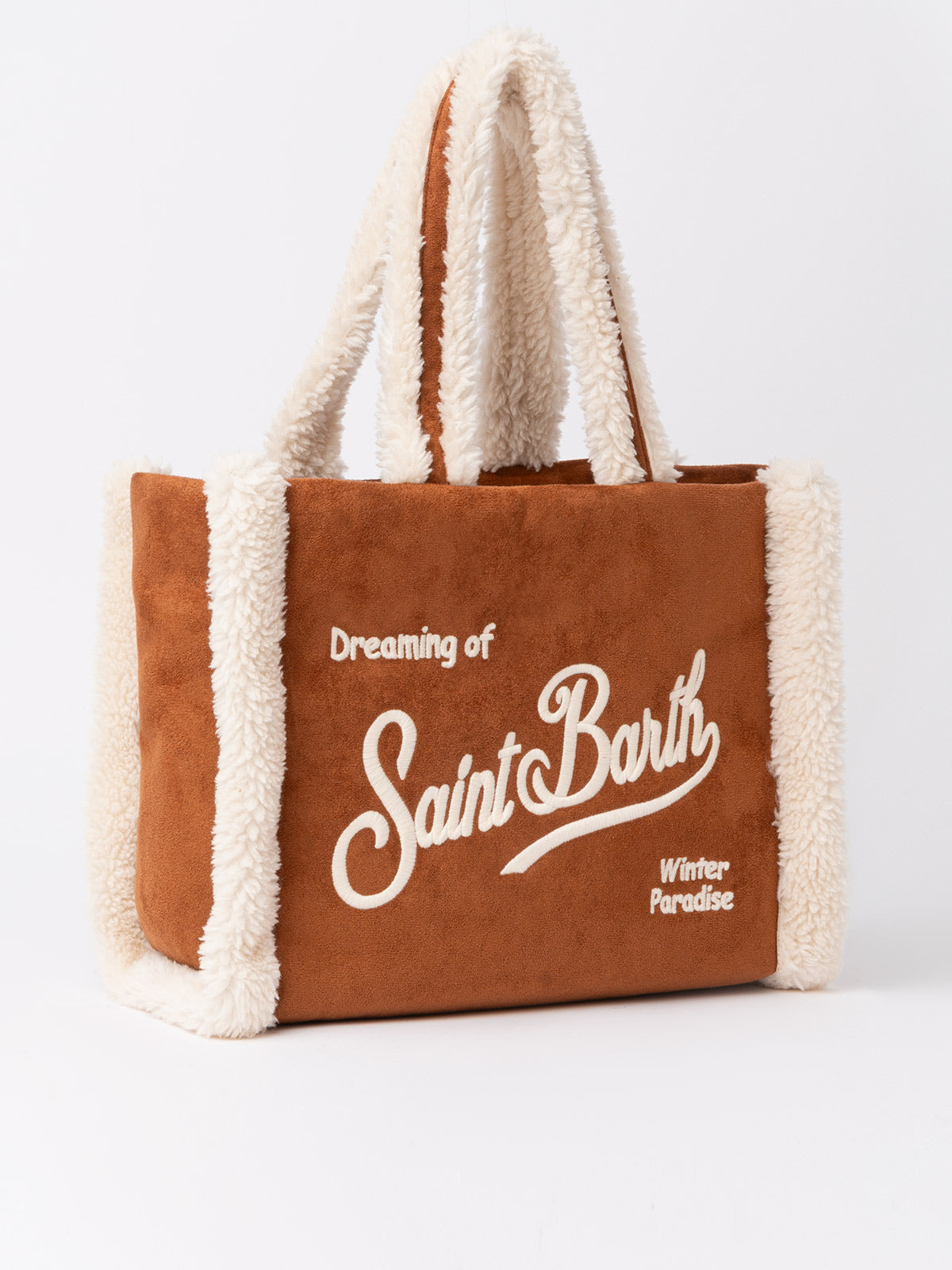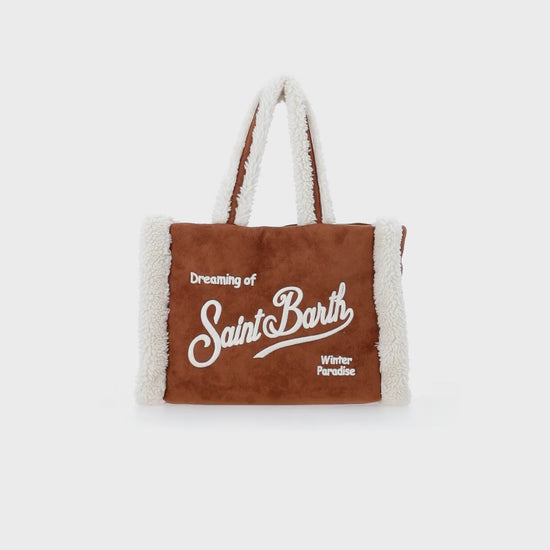 Borsa piccola morbida in pelle di montone color cammello con logo Saint Barth e tracolla