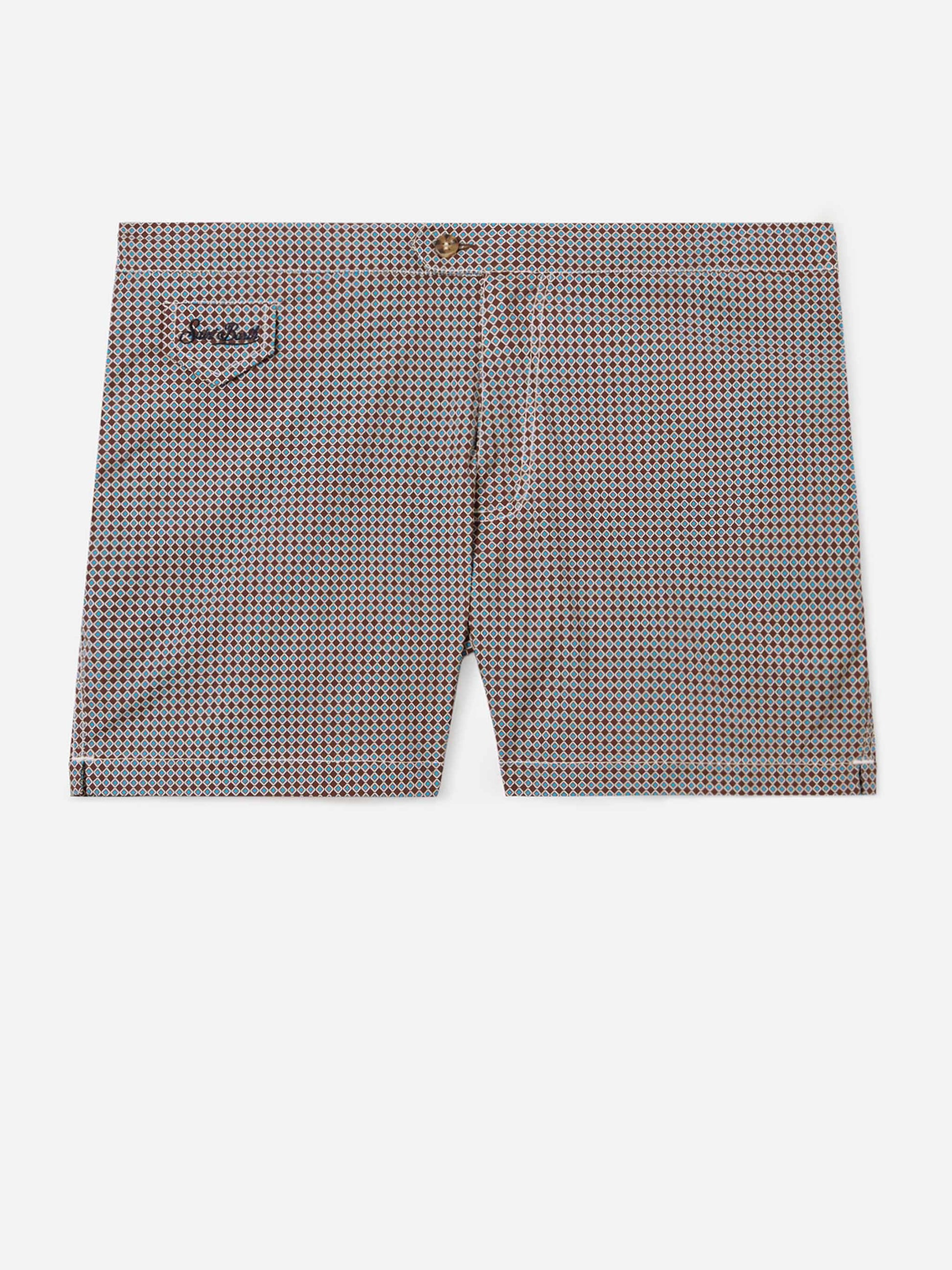 Il costume mare Harrys è realizzato in tessuto leggero e traspirante, pensato per offrire comfort e libertà di movimento durante l’utilizzo. La stampa geometrica all-over nei toni del marrone e dell’azzurro caratterizza il design con un motivo grafico elegante e distintivo. La costruzione con cintura e bottone logato effetto horn, patta frontale con zip e vita elasticizzata sui fianchi assicura una vestibilità stabile e confortevole. I dettagli funzionali, come le tasche laterali a filetto, la tasca posteriore con zip e la retina interna elasticizzata antibatterica, completano il modello garantendo praticità e traspirabilità. Il modello fa parte della capsule Ties.