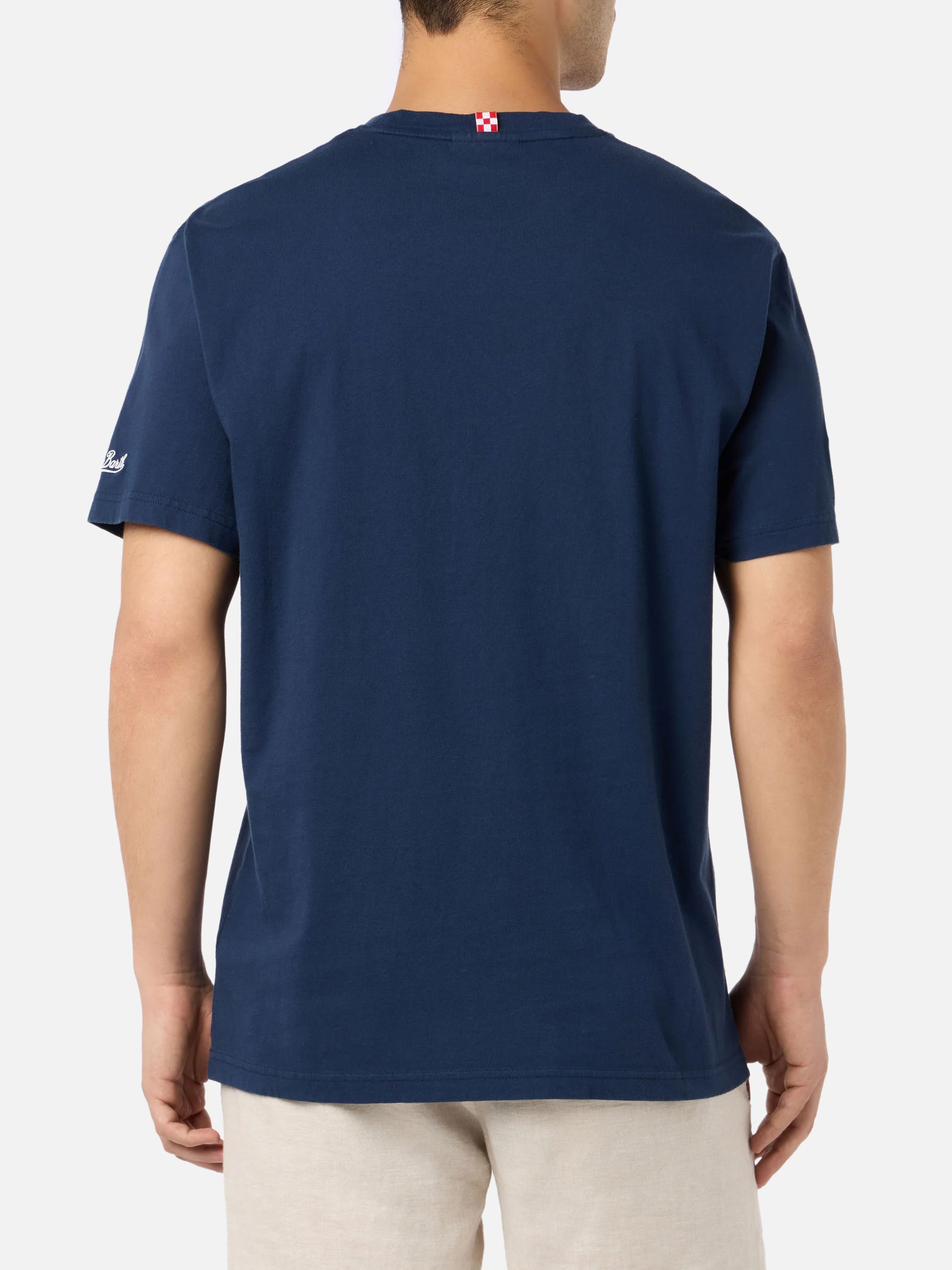 Ecco la T-shirt Man, l'iconica t-shirt da uomo di MC2 Saint Barth, con stampe audaci e grandi sui temi preferiti del marchio, tra cui viaggi, stile di vita, destinazioni iconiche, cocktail e le collaborazioni più cool. Questa t-shirt da uomo a mezza manica è realizzata in tessuto jersey di cotone al 100% con finitura tinta in capo, pesa 180 grammi per una sensazione di leggerezza. Vanta una vestibilità regolare per un uso confortevole ed è decorata con una stampa e un ricamo sul petto, insieme al ricamo MC2 Saint Barth sul fondo della manica sinistra. T-shirt da uomo in cotone T-shirt Uomo Sfondo bianco Ricamo Avanti Lazio,Famoje 3 goal! sul petto a sinistra Tinto in pezza Girocollo Maniche corte Firma MC2 Saint Barth ricamata sulla manica sinistra Composizione: 100% cotone. Vestibilità classica La taglia grande ha una lunghezza del corpo di 72 cm con un incremento di 2 cm per taglia; una larghezza delle spalle di 48 cm con un incremento di 2 cm per taglia; e una misura del mezzo torace di 56 cm con un incremento di 2,5 cm per taglia Il modello è alto 185 cm e indossa una taglia grande