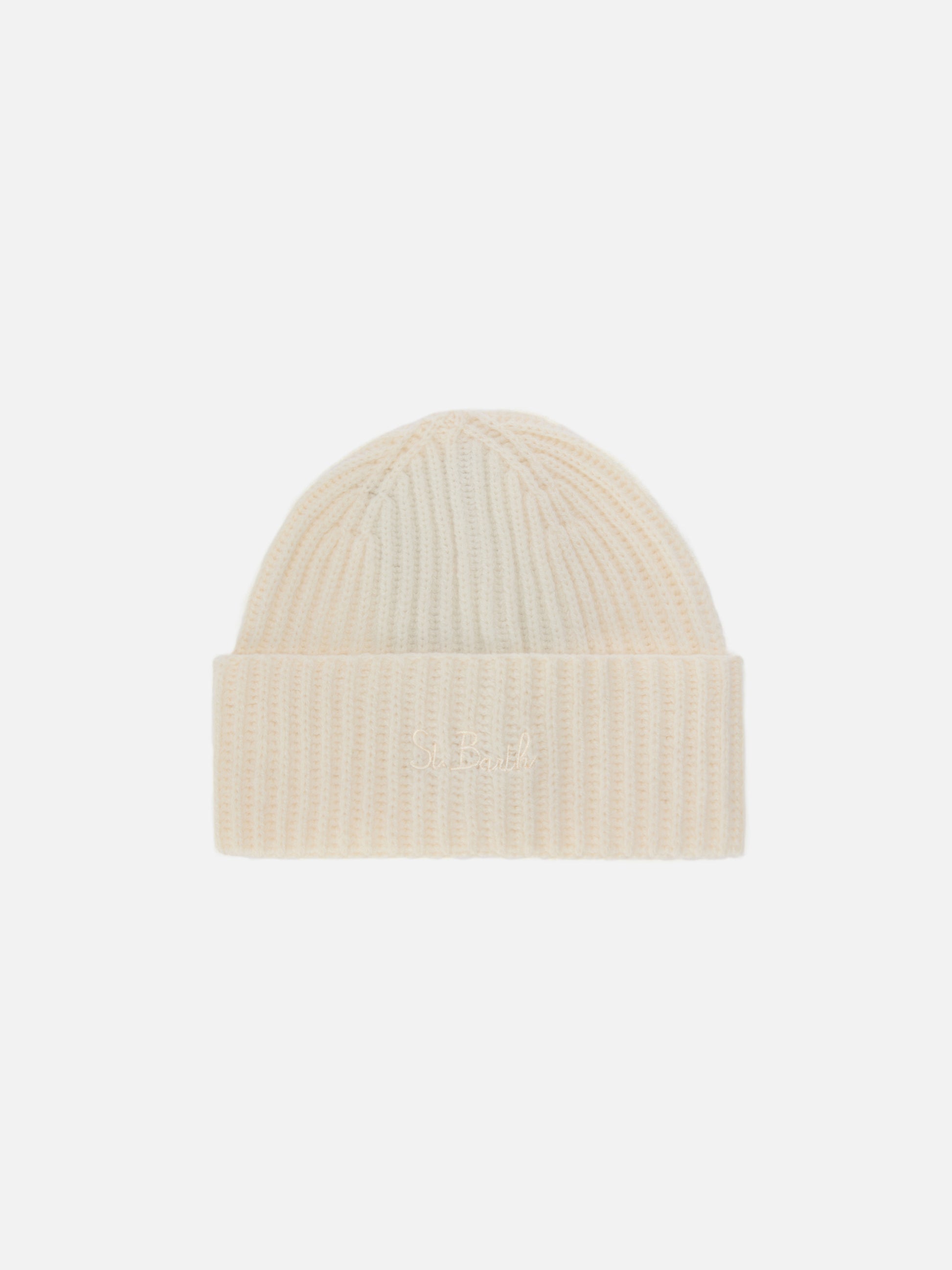 Berretto Moss Jr in maglia bianca a coste con ricamo St. Barth