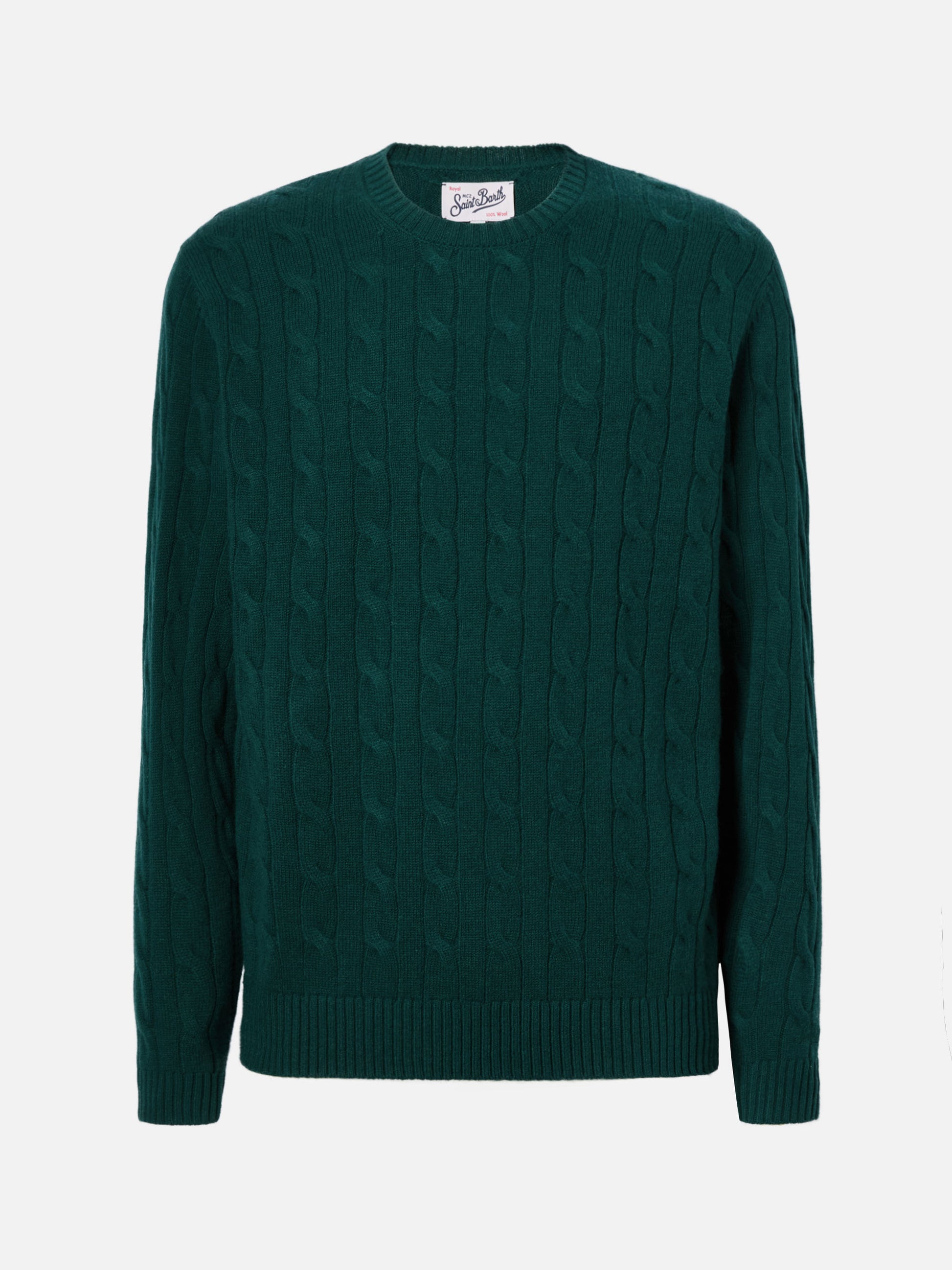 Regent a trecce verde inglese è il cable knit essenziale per il quotidiano: caldo e robusto, perfetto su denim e chino o sotto un blazer casual.