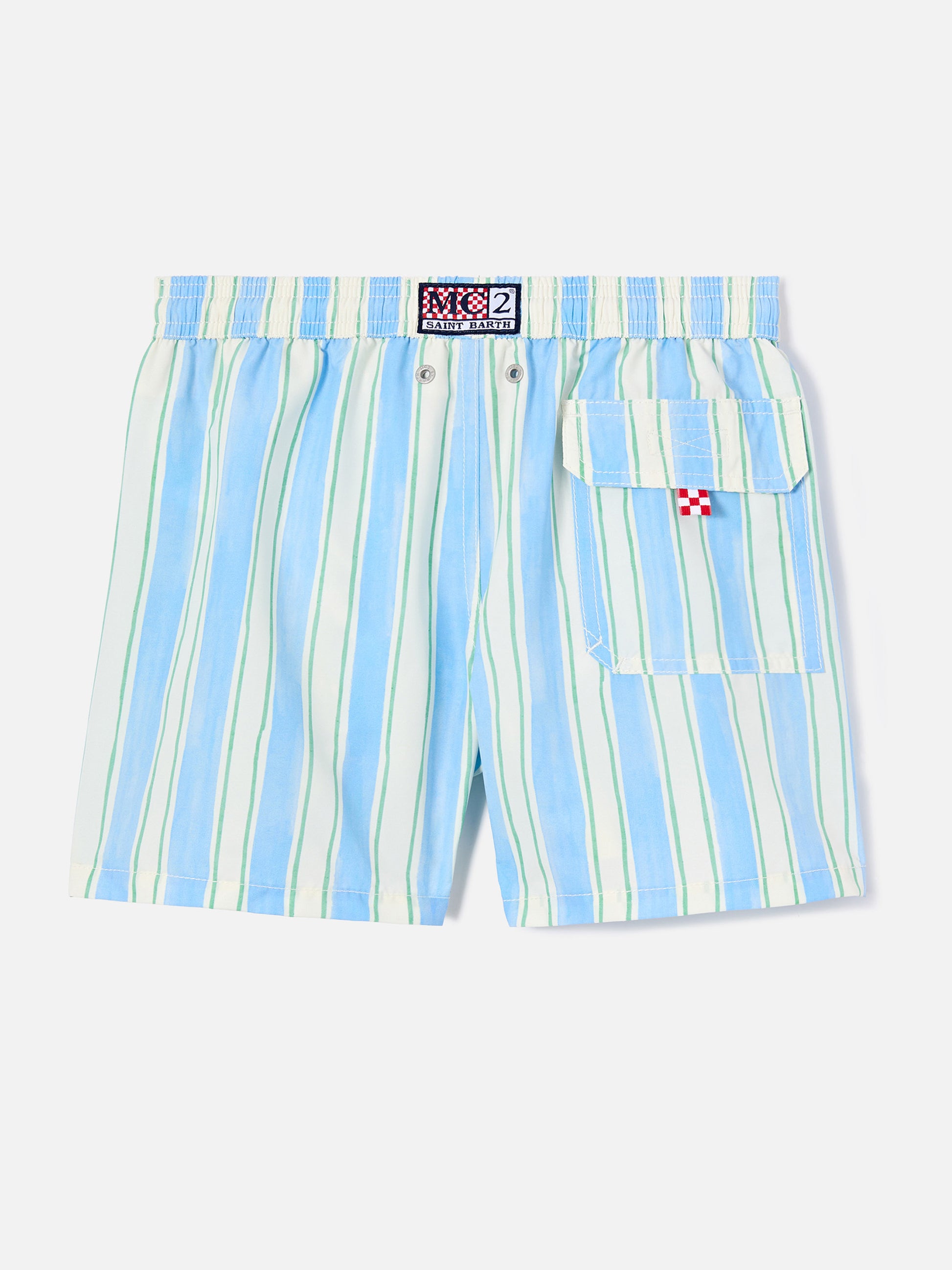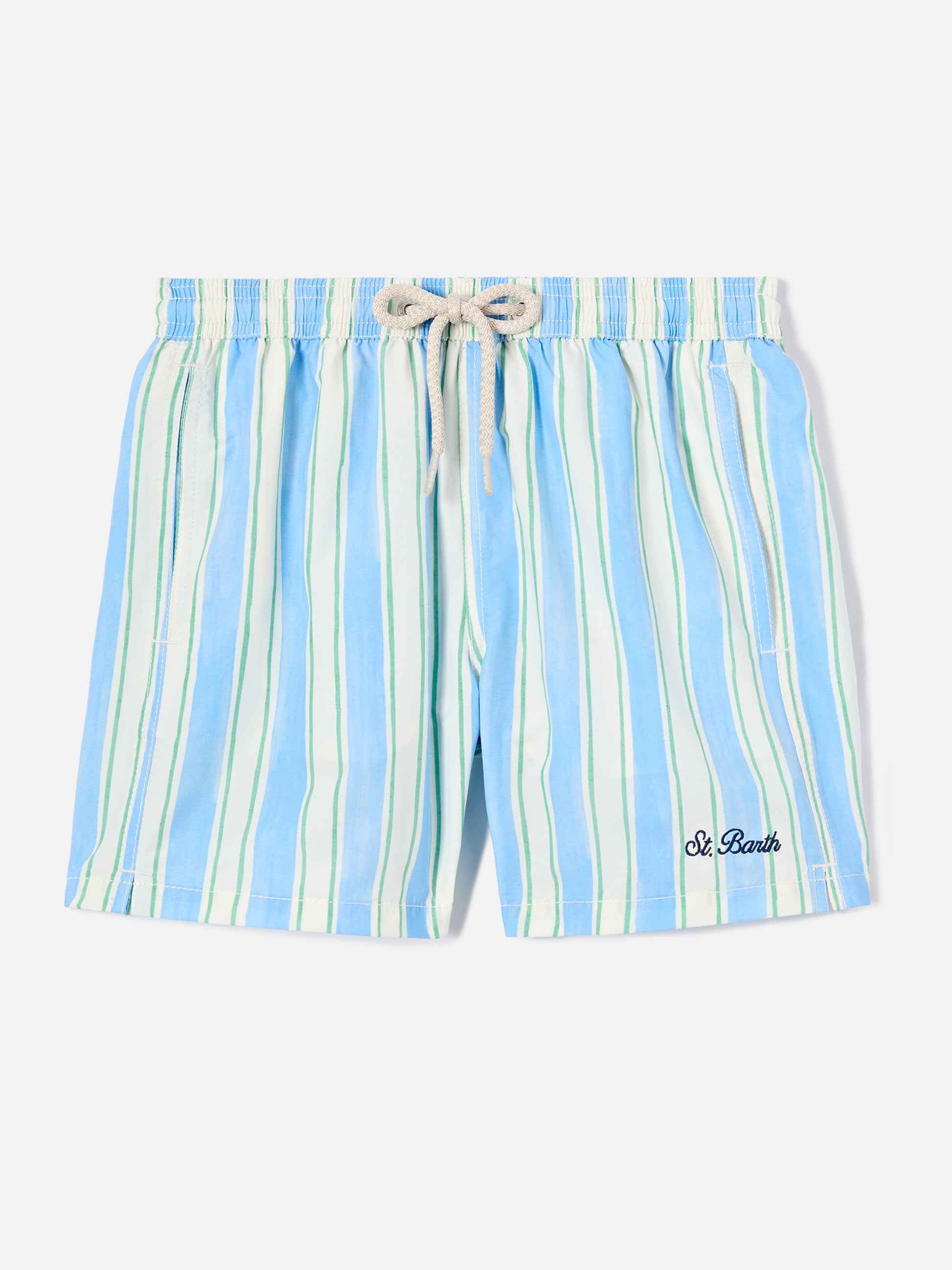 Costume Syros Jr da bambino Bianco, azzurro e verde A righe larghe Ricamo St. Barth a contrasto sulla gamba Tessuto traspirante e quick drying Vita elasticizzata con coulisse regolabile Cordino regolazione vita con finale logato Eyelet metallici logati Due tasche laterali rinforzate Tasca posteriore con patella e chiusura in velcro Dettaglio tiretto e apertura per il drenaggio Spacchetti laterali rinforzati Retina interna elasticizzata con comfort elevato e antibatterica Accessori metallici nickel free Vestibilita regolare. Tienilo in considerazione nella scelta della taglia.