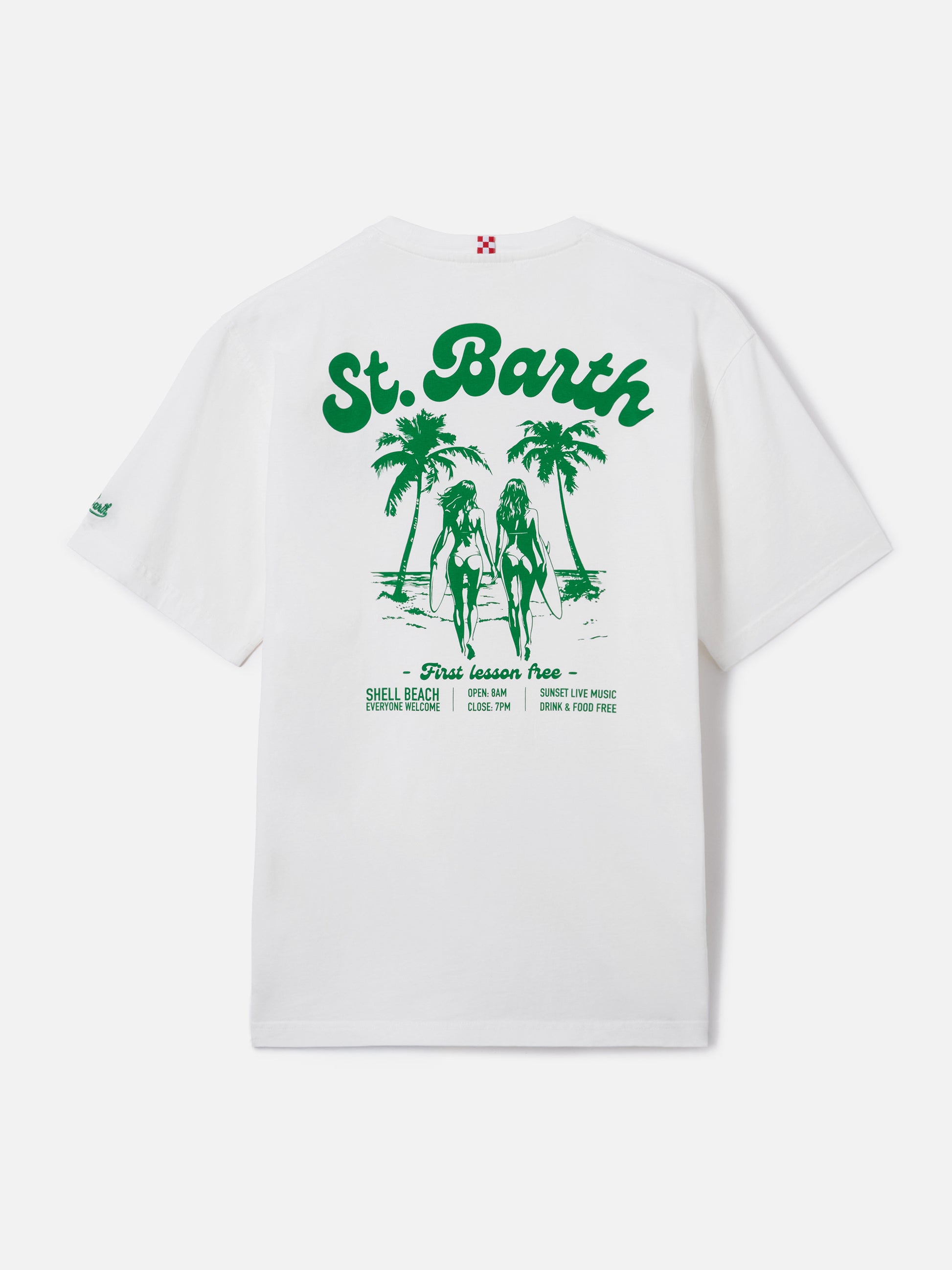 https://it.mc2saintbarth.com/it/products/white-portland-t-shirt-with-surf-lessons-free-print10777978241370T-shirt Portland bianca con stampa Surf Lessons Free89,00https:files/UID_PRL000204255L-MAN-T-SHIRT-WHITE-MC2-MC2_4.jpghttps:files/UID_PRL000204255L-MAN-T-SHIRT-WHITE-MC2-MC2_4.jpgEURInStockT-SHIRT650948215130All Products - Only Man649134276954AVADA - Best Sellers278942318776Cocktail Capsule647473135962Sport Club T-Shirts626258936154St. Barth Sports Club - Uomo288164774072T-Shirt Uomo647472087386T-shirts con stampa654690484570UpSelling_Man_T-shirtsLa t-shirt Portland è realizzata in puro cotone, progettata per offrire comfort e una sensazione naturale sulla pelle. Il design bianco tinta unita valorizza la costruzione essenziale del capo. Il modello presenta una stampa Surf Lessons Free sul petto, mentre sul retro è arricchito da una maxi grafica con palme, surfiste e lettering ispirati all’atmosfera balneare di Saint Barth. Il capo è rifinito con ricamo logo sulla manica, scollo a girocollo, maniche corte e linea dritta con vestibilità regolare.