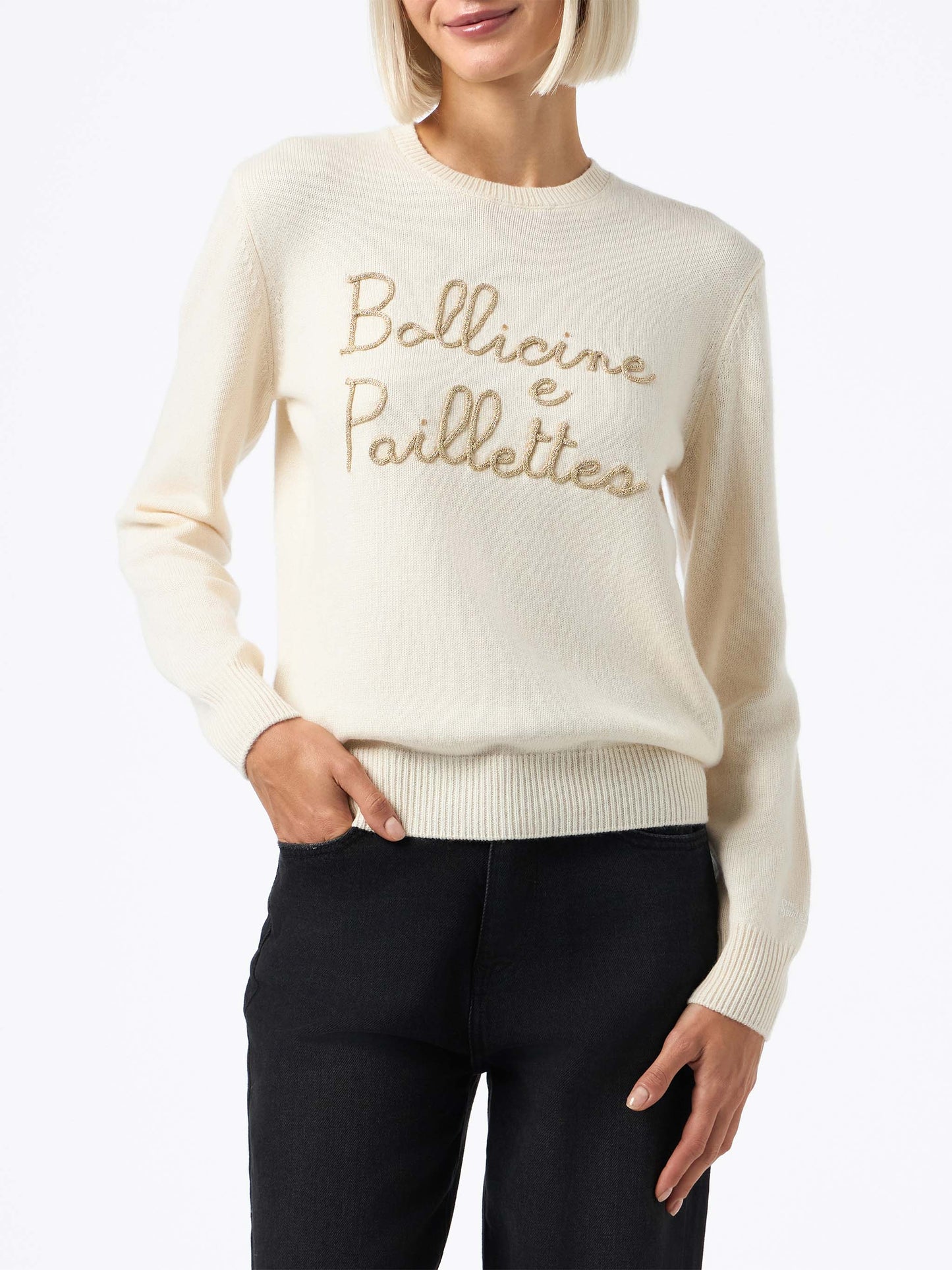Maglione da donna beige New Queen con ricamo paillettes Bollicine