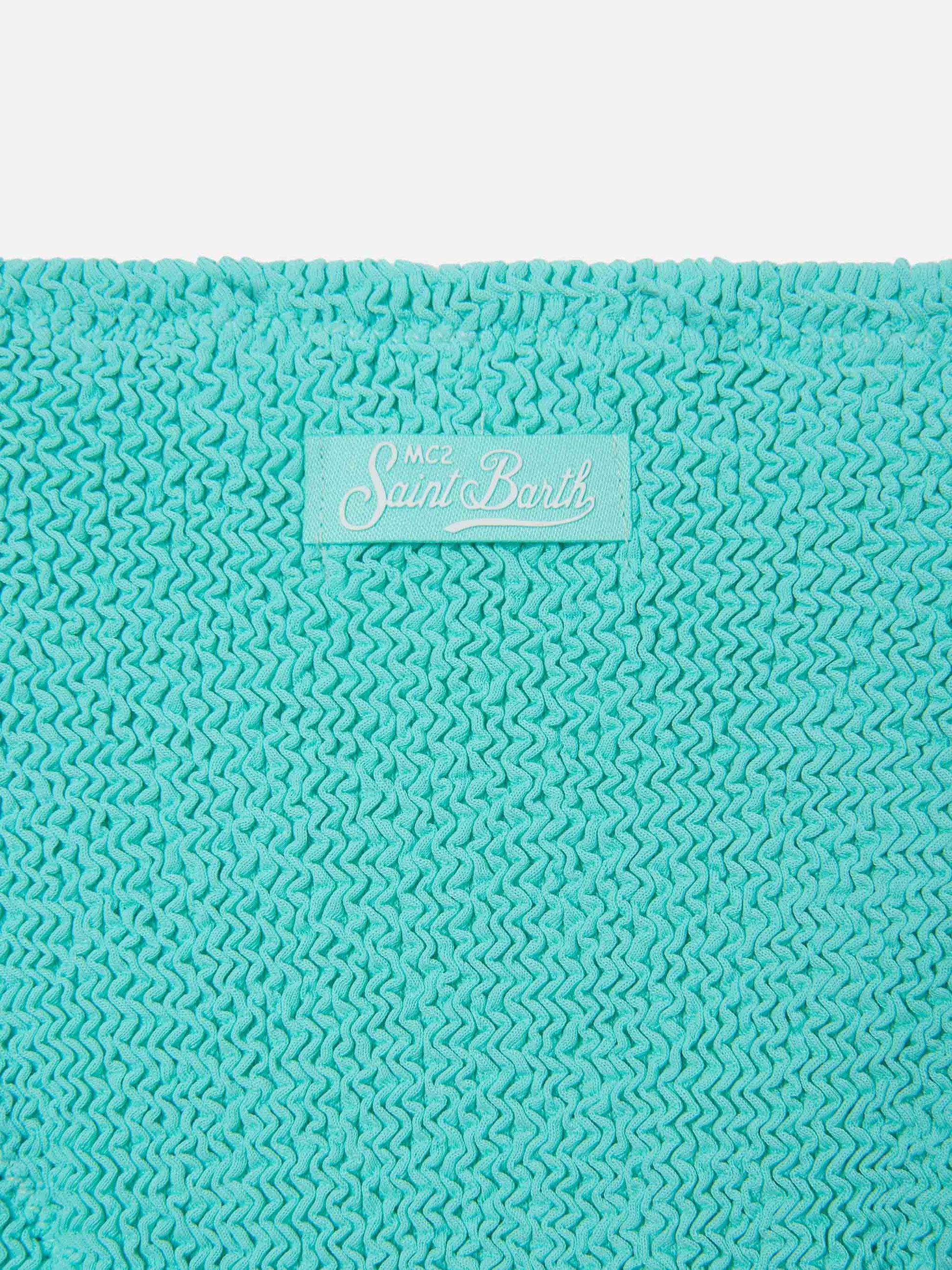 The Baker bikini is crafted in solid water green stretch crinkle fabric. The style includes a bralette top with wide non-adjustable straps and classic bottoms with regular coverage. The highly elastic fabric naturally adapts to the body ensuring comfort. The swimsuit is unlined and features a fitted silhouette.