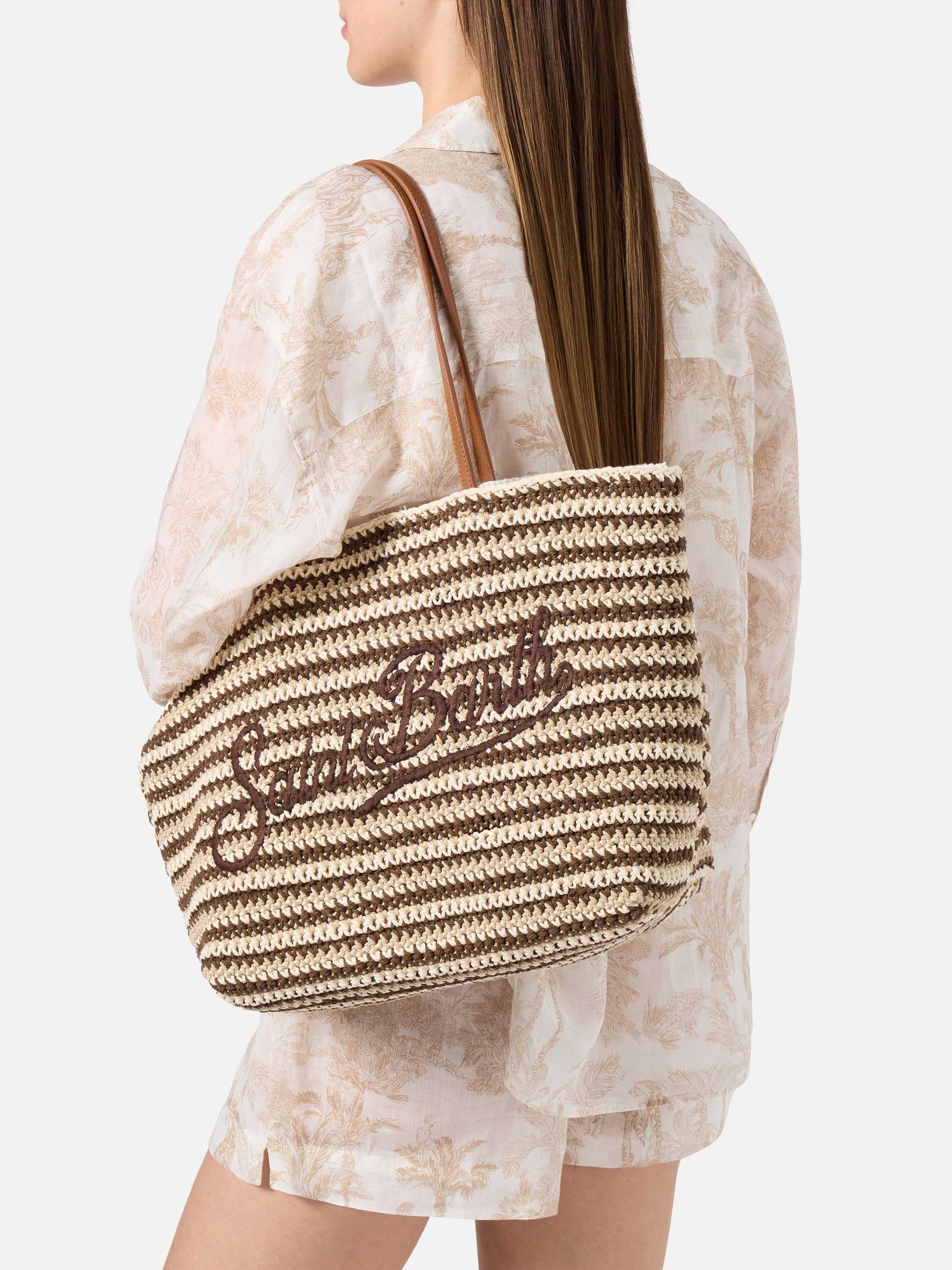 Crochet Tote bag in beige and brown stripes with embroidered logo