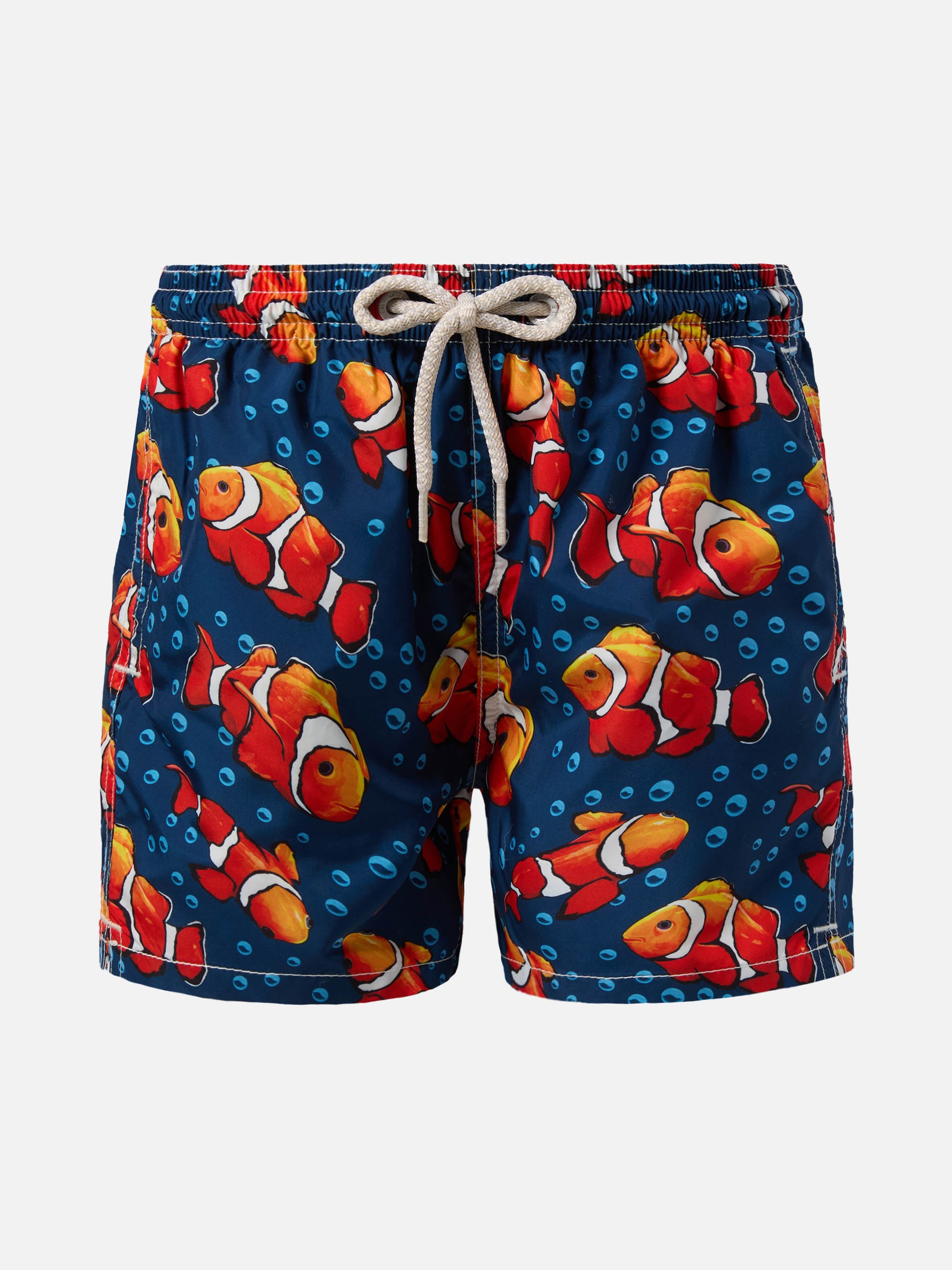 Jean Lighting mid-length swim shorts are the mini-me version of the Lighting model, designed for comfort and quick drying. Featuring an elasticized waistband, branded eyelets for water drainage, and practical pockets, they combine style and functionality. Made from 100% recycled polyester, they reflect MC2 Saint Barth’s commitment to sustainability. Boy Jean Lighting mid-length swim shorts Lightweight fabric Quick drying Shark all-over print Orange backcloth Comfortable elasticized waistband Adjustable drawcord with branded terminals Inner mesh lining Side pockets with French seams Back patch pocket with magnetic closure Branded eyelets designed to drain water and prevent ballooning effect MC2 Saint Barth exclusive label on the back Classic fit Composition: 100% recycled polyester Size 6 yrs has a half waistband width of 36 cm (stretched) and varies by 1,5/3 cm for each size, depending on the size; side length including waistband 23 cm and varies by 1,5/3 cm for each size, depending on the size Please note that all measurements provided are approximate and subject to a tolerance of 1-2 cm due to manual measurement. This tolerance range is normal and should be expected. Care Instructions: cold wash by running water and neutral soap. Hang to dry. Do not leave to soak and do not dry in contact with other clothing. Do not leave the garment wet in contact with other clothing.