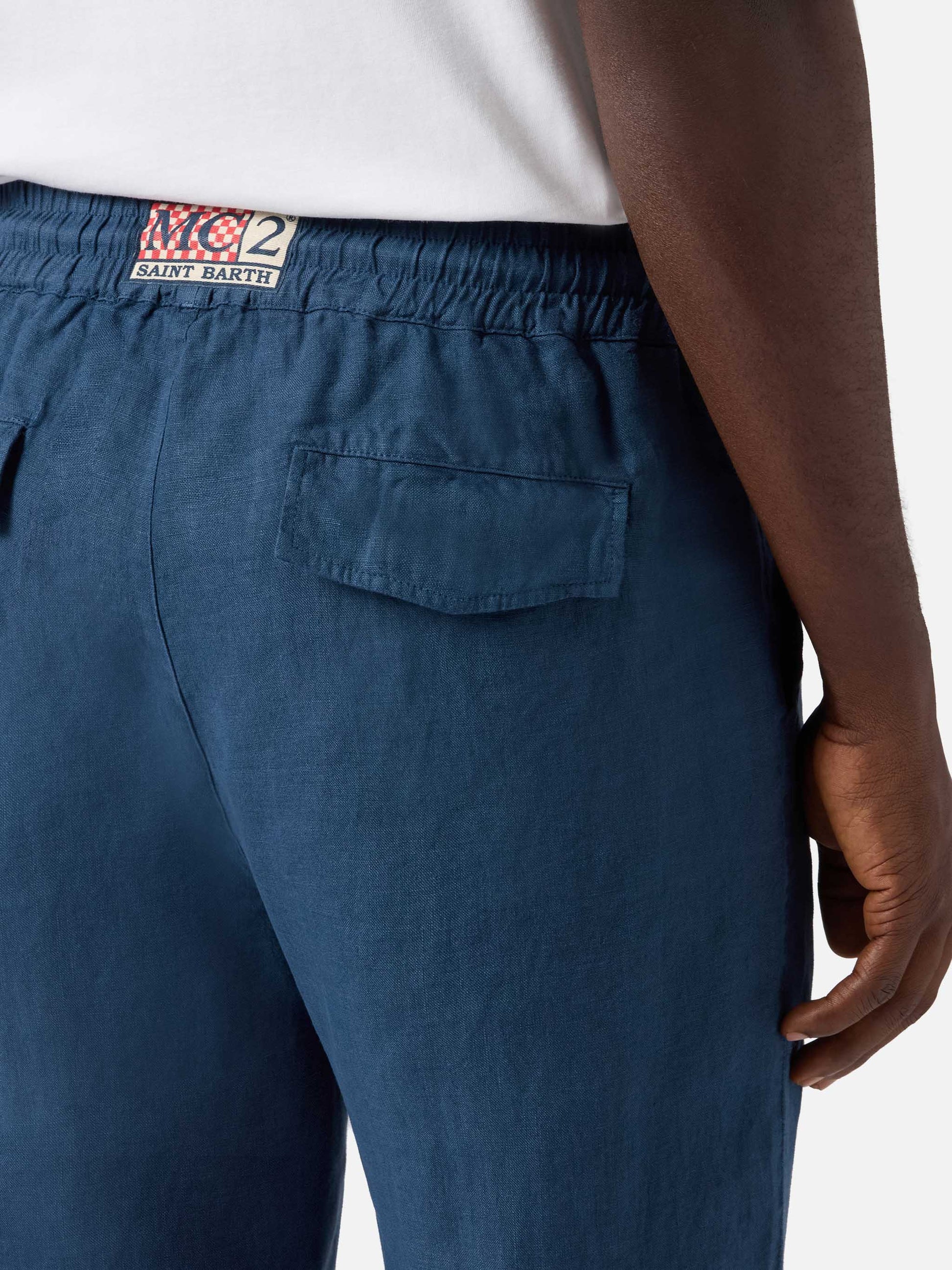 https://it.mc2saintbarth.com/products/navy-blue-brown-calais-long-pants-in-pure-linen10781194518874Navy blue brown Calais long pants in pure linen189,00https:files/UID_CAA000109931L-MAN-PANT-BLUE-MC2-MC2_2.jpghttps:files/UID_CAA000109931L-MAN-PANT-BLUE-MC2-MC2_2.jpgEURInStockPANT650948215130All Products - Only Man649134276954AVADA - Best Sellers293962940600Man Linen Collection278947365048Man pants and bermuda654690877786UpSelling_Man_PantsThe Calais long pants are crafted from pure linen, a lightweight and breathable fabric designed to offer comfort and ease. The solid color design enhances the clean aesthetic of the style. The elasticated waistband with braided rope drawstring with white-red binding allows easy adjustment of the fit. The style is completed with front slanted pockets, back flap pockets with logo buttons and a logo label applied at the center back of the waistband. The straight leg and relaxed fit ensure comfort and freedom of movement.