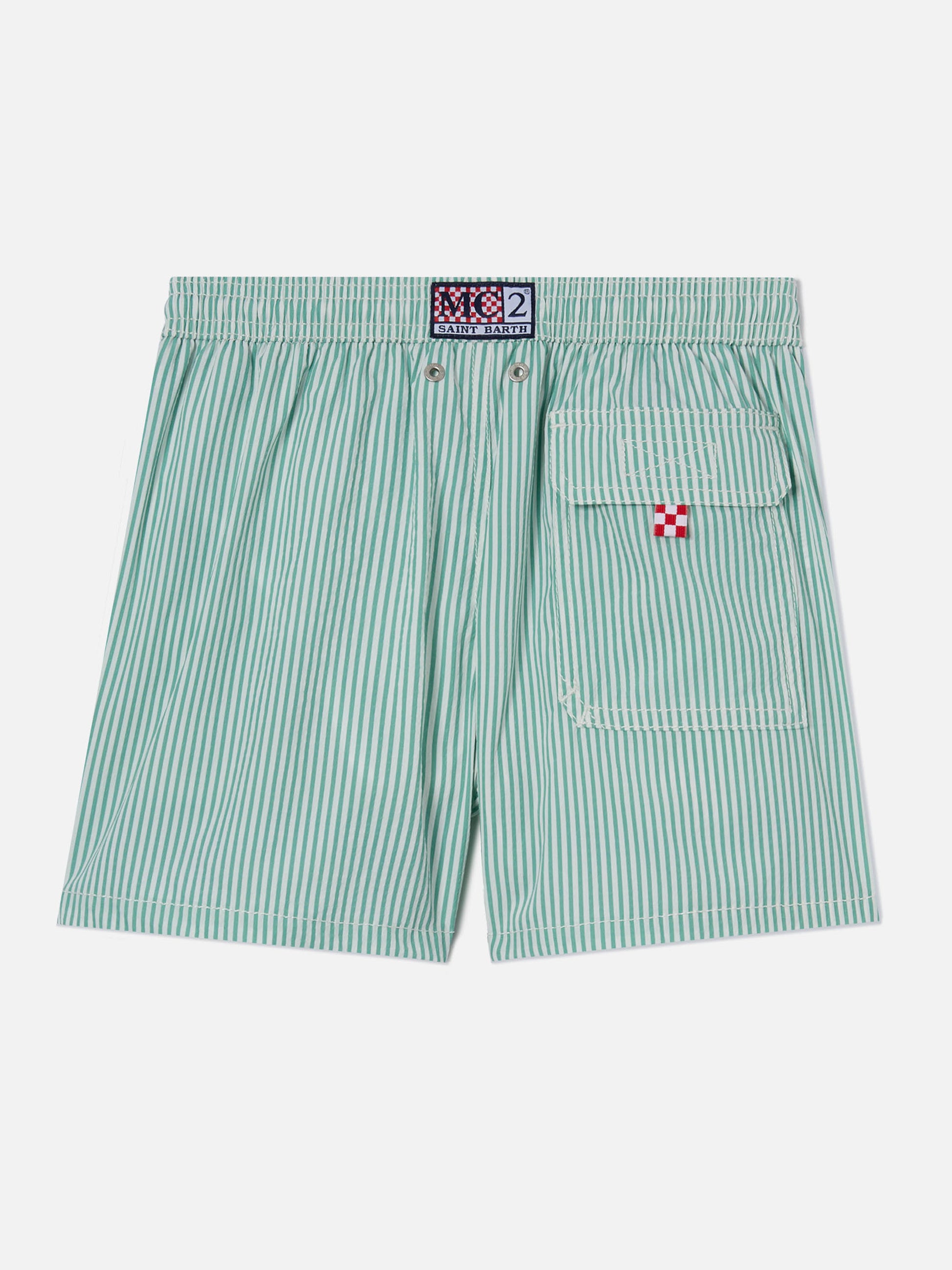 Patmos Jr boys swim shorts Mint green Striped Contrasting St. Barth embroidery on the leg Breathable seersucker fabric with quick drying properties Elasticated waistband with adjustable drawstring Waist drawstring with branded ends Branded metal eyelets Two reinforced side pockets Back patch pocket with flap and velcro closure Puller detail and drainage opening Reinforced side slits Elasticated antibacterial inner mesh with enhanced comfort Nickel free metal accessories Regular fit. Please keep this in mind when selecting your size.