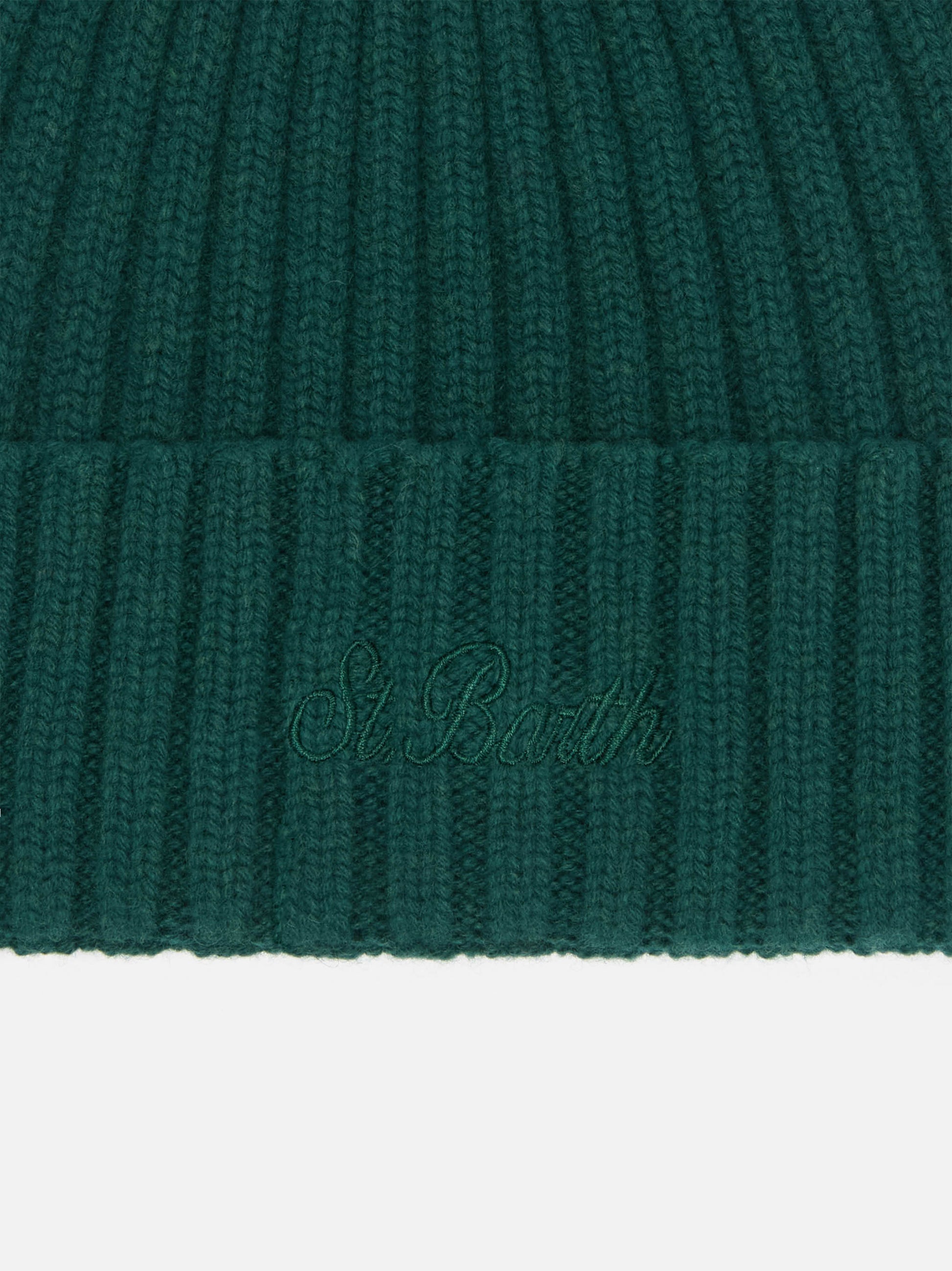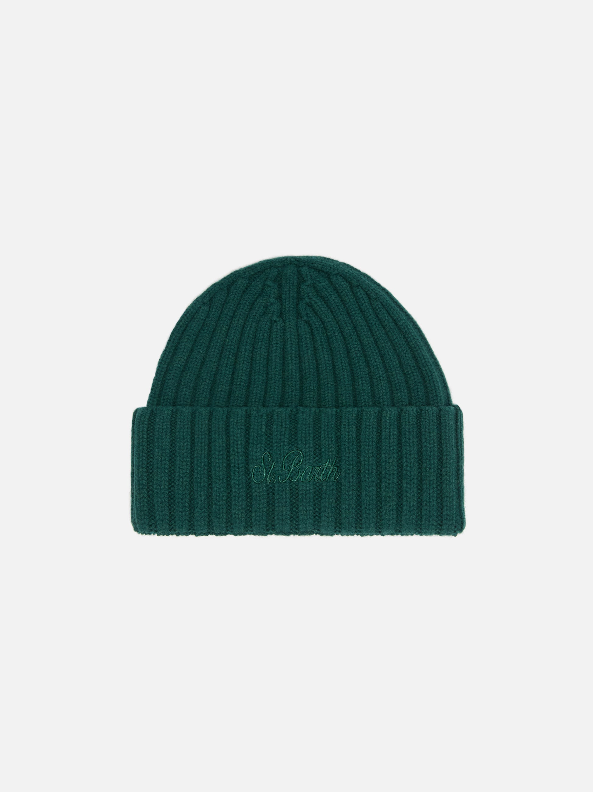 Wengen beanie in British green wool with St. Barth embroidery on the turn-up