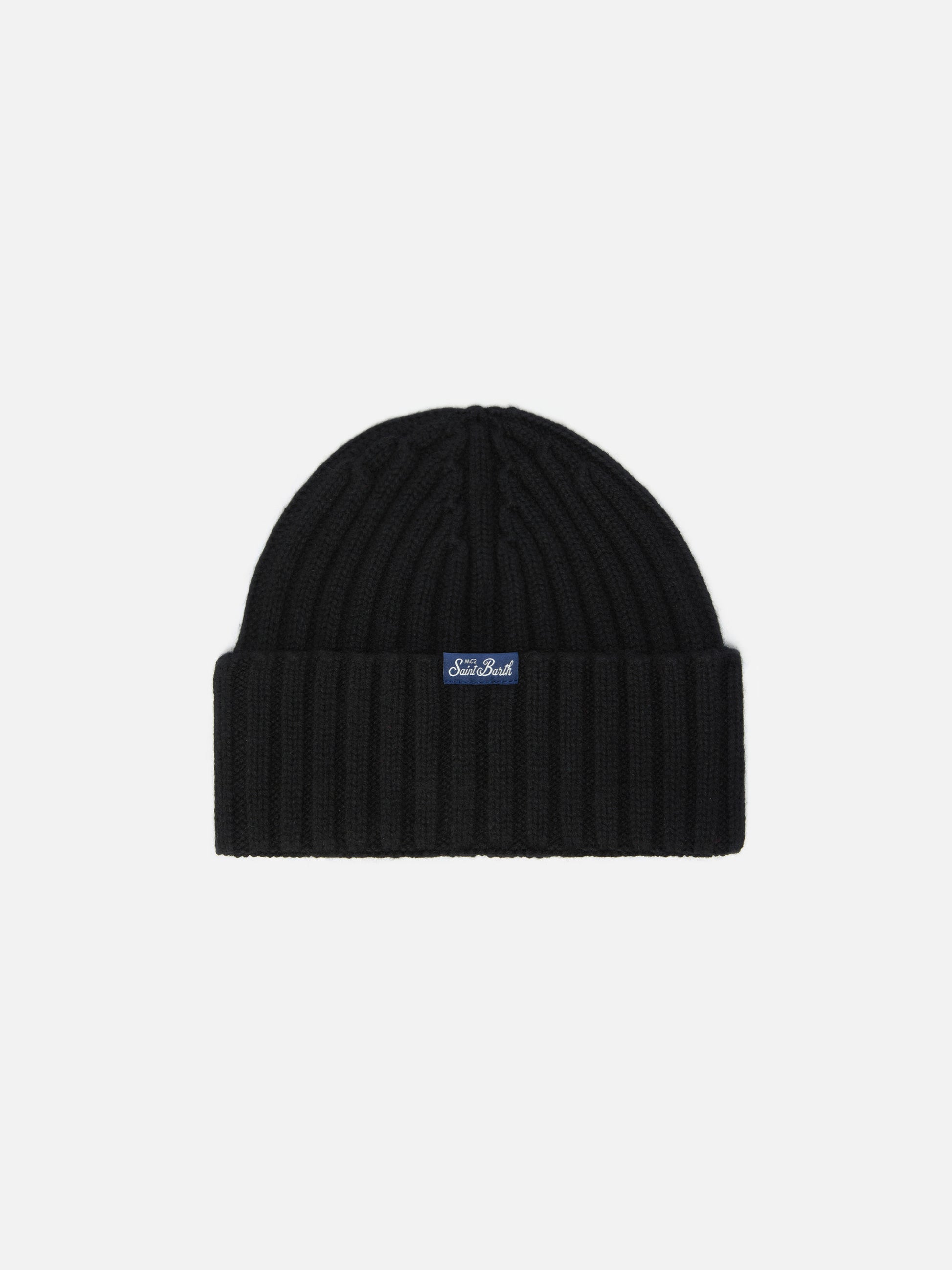 Wengen Jr beanie in cashmere blend in black with Piccola Peste embroidery