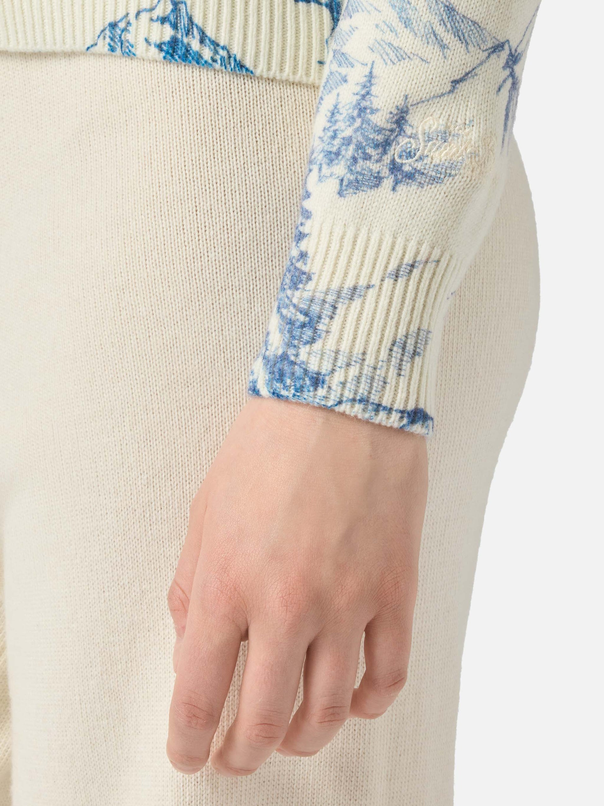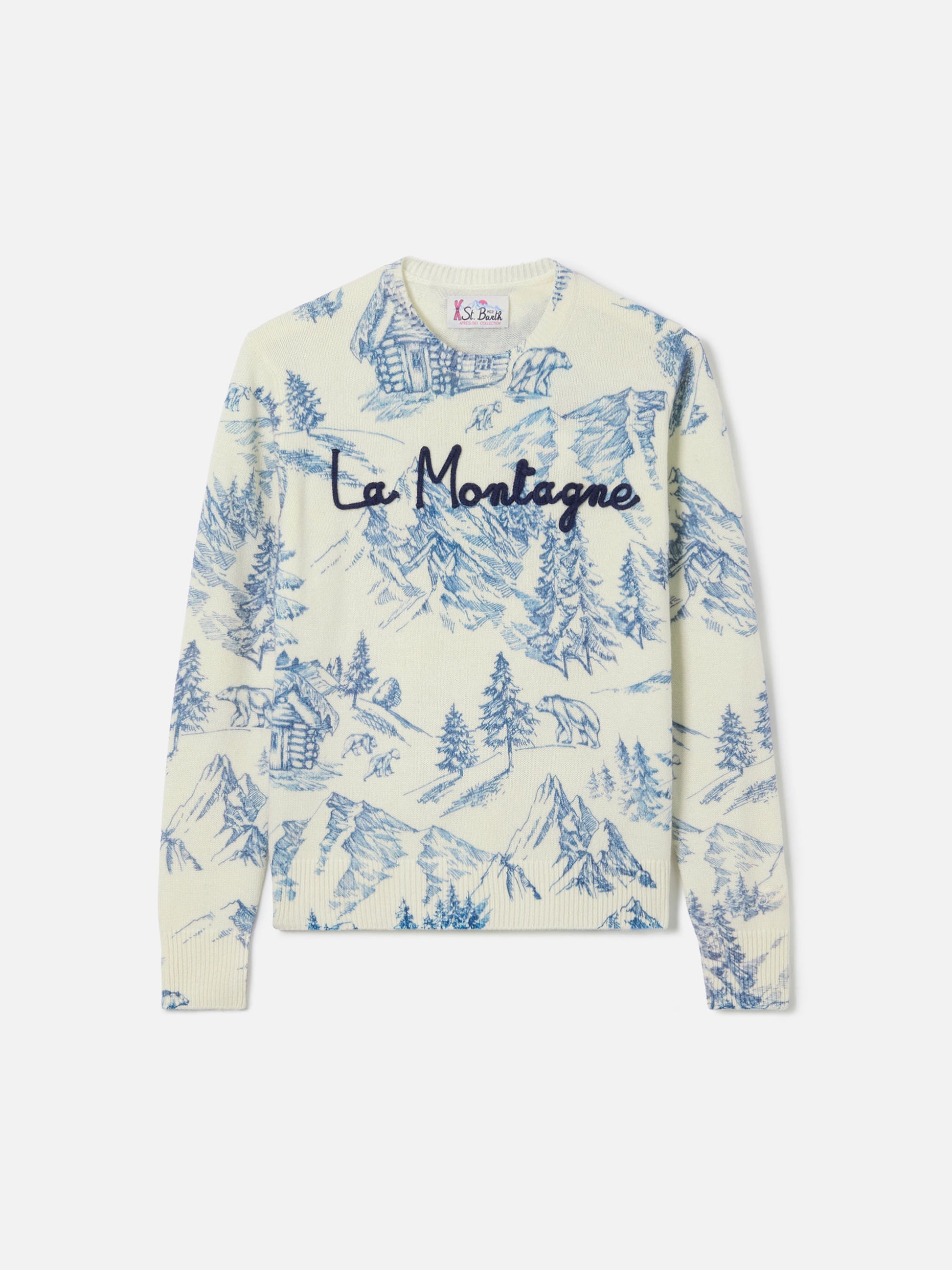 Woman white sweater New Queen with toile de jouy print and La Montagne embroidery